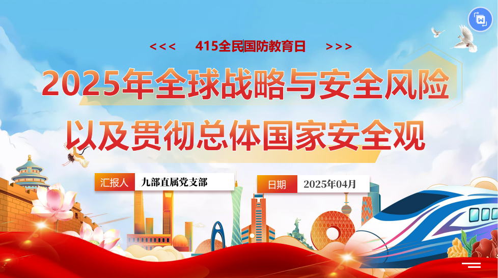首先,九部直属党支部书记杨宏同志开展了“贯彻总体国家安全观”的党课培训。培训报告概要分析了2025年全球在经济、国际格局、冲突、科技等方面的形势,指出世界经济复苏疲弱且不确定性增加、国际格局面临变革挑战、俄乌和巴以冲突持续升级、新兴技术发展带来机遇与挑战并存;同时强调中国在百年变局中是稳定力量,将继续推动全球经济增长、维护世界和平、促进共同繁荣;培训呼吁广大职工深刻领悟总体国家安全观,掌握相关法律法规,养成良好习惯,积极识别和防范安全风险,展现责任和担当。