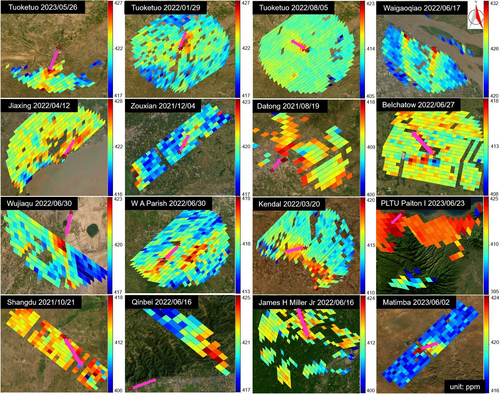 针对上述问题,该研究团队基于美国轨道碳观测卫星3号(OCO-3),创新提出“两段线性回归融合高斯函数拟合”模式优化算法,大幅提升碳排放背景值识别效率;运用曼惠特尼秩和检验,开发动态风向校正算法,增强烟羽轨迹反演精准度;构建基于大气稳定性分级响应机制的烟羽抬升模型,精确刻画烟气动态抬升过程,首次实现大型燃煤电厂二氧化碳排放的高精度动态量化与制图。