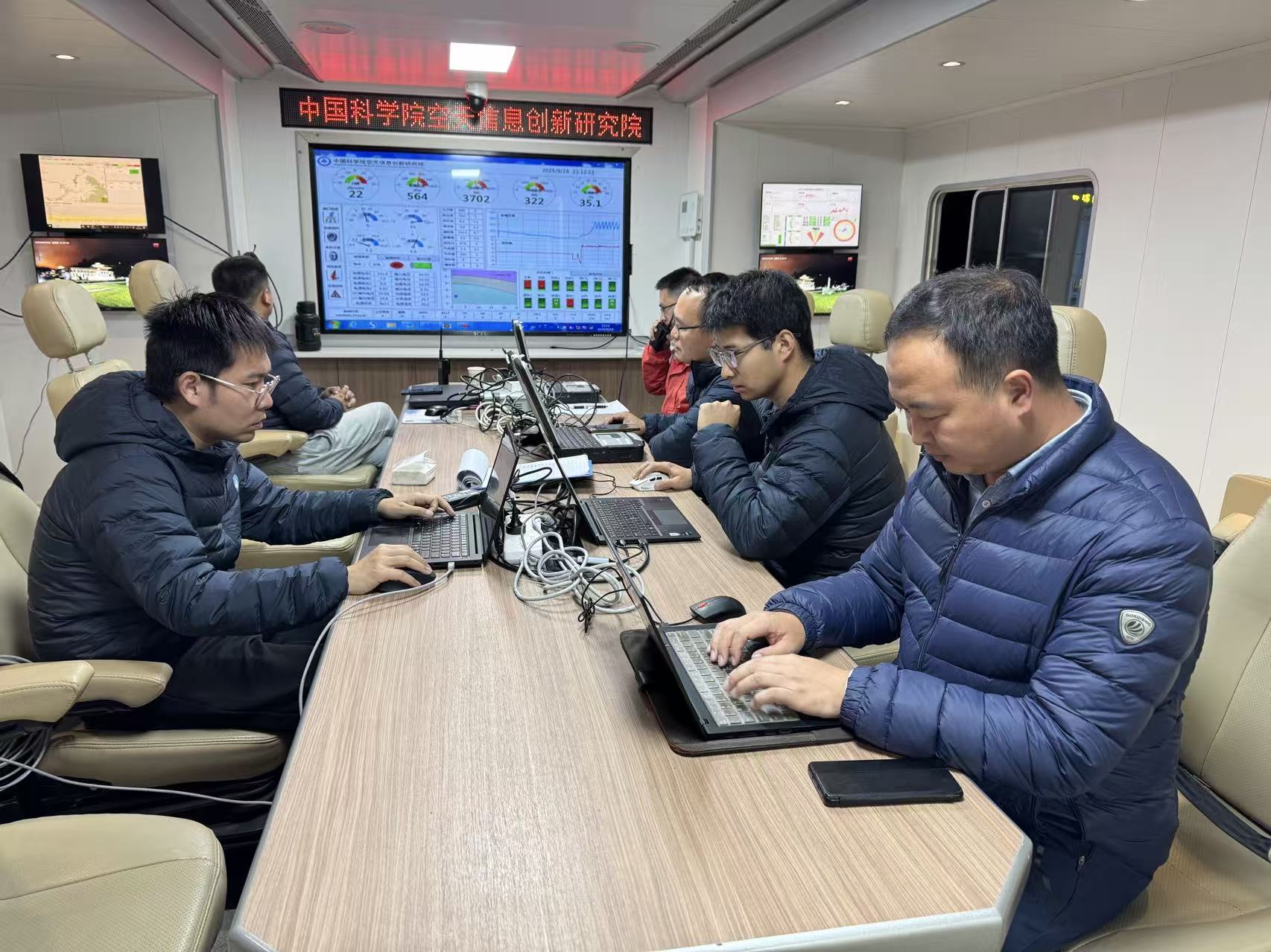 试验队员正在指挥车内工作(左一为屈维,右一至四依次为张泰华、袁仲豪、杜晓伟、张强辉)。冯丽妃摄