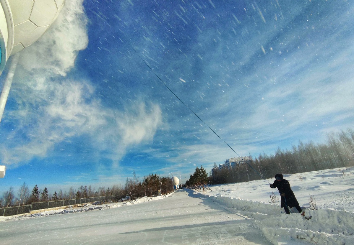 除雪是冬季运行的重要工作。为保障数据接收质量,每部天线罩需及时清除积雪,值守人员通过拽动除雪绳作业,雪厚时往往浑身湿透、体力耗尽。但当看到“飞起玉龙三百万”的雪沫在蓝天中飞扬,大家总能从中寻得空天人独有的诗意与力量。这份坚守换来了丰硕成果:2025年5月,漠河站一期基建项目基本完成;6月5日,顺利通过系统现场验收评审;12月12日,正式投入运行。
