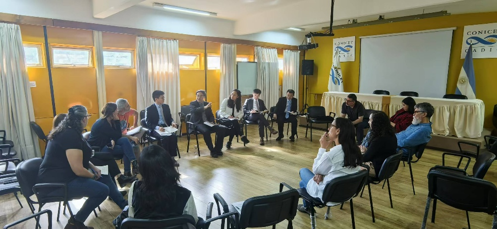代表团在访问阿根廷科学技术研究理事会(CONICET)南方研究中心(CADIC)期间,与阿方学术顾问委员会委员以及相关科研人员召开专题研讨会。双方在研讨会上,相互了解各自的科研优势与国际合作基本情况;围绕地球科学、生物与海洋学、农业科学和考古学等领域,以及南极与亚南极相关研究主题做专题交流;就进一步推动人员互访交流,探索建立气候变化与可持续发展联合研究机构等方面达成一致意见。另外,双方团队联合开展了海洋生物、亚南极生态与生物多样性,7000年前火地岛区域古人类活动遗迹,安第斯山南部冰川、森林、生态与生物多样性科学考察。