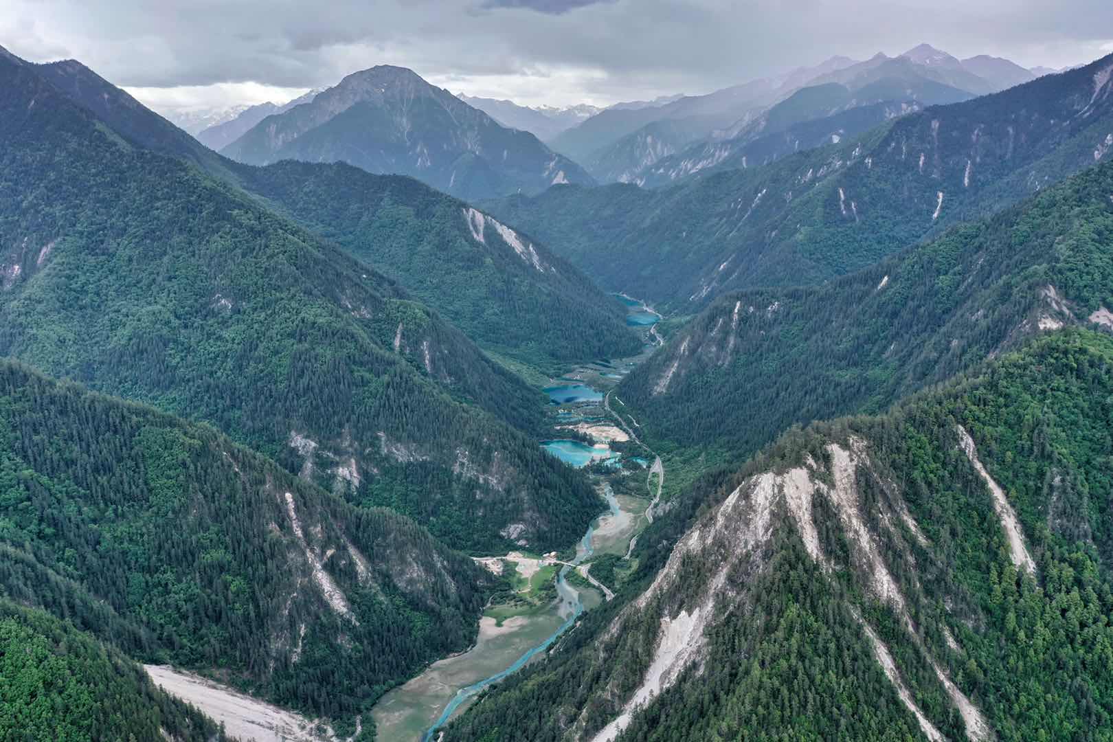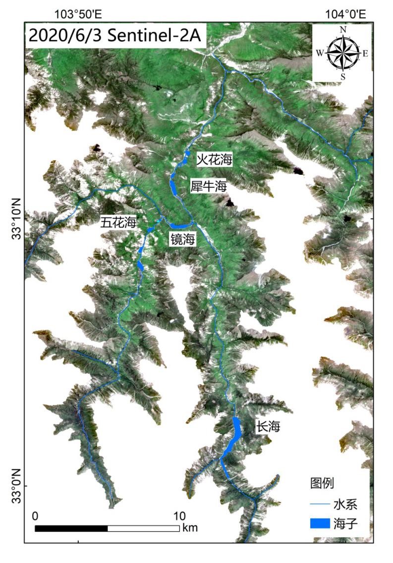 其中,树正沟(沟口至诺日朗瀑布)全长约13.8km,海拔约2500-2600m,主沟段由北向南依次为火花海、双龙海、树正群海、犀牛海;日则沟全长约25.3km,海拔约2600-3100m,由北向南有镜海、珍珠滩、金铃海、五花海、熊猫海、箭竹海;则查洼沟长约31.7km,海拔约2600-3100m,从北向南有下季节海、上季节海、五彩池、长海(图1)。