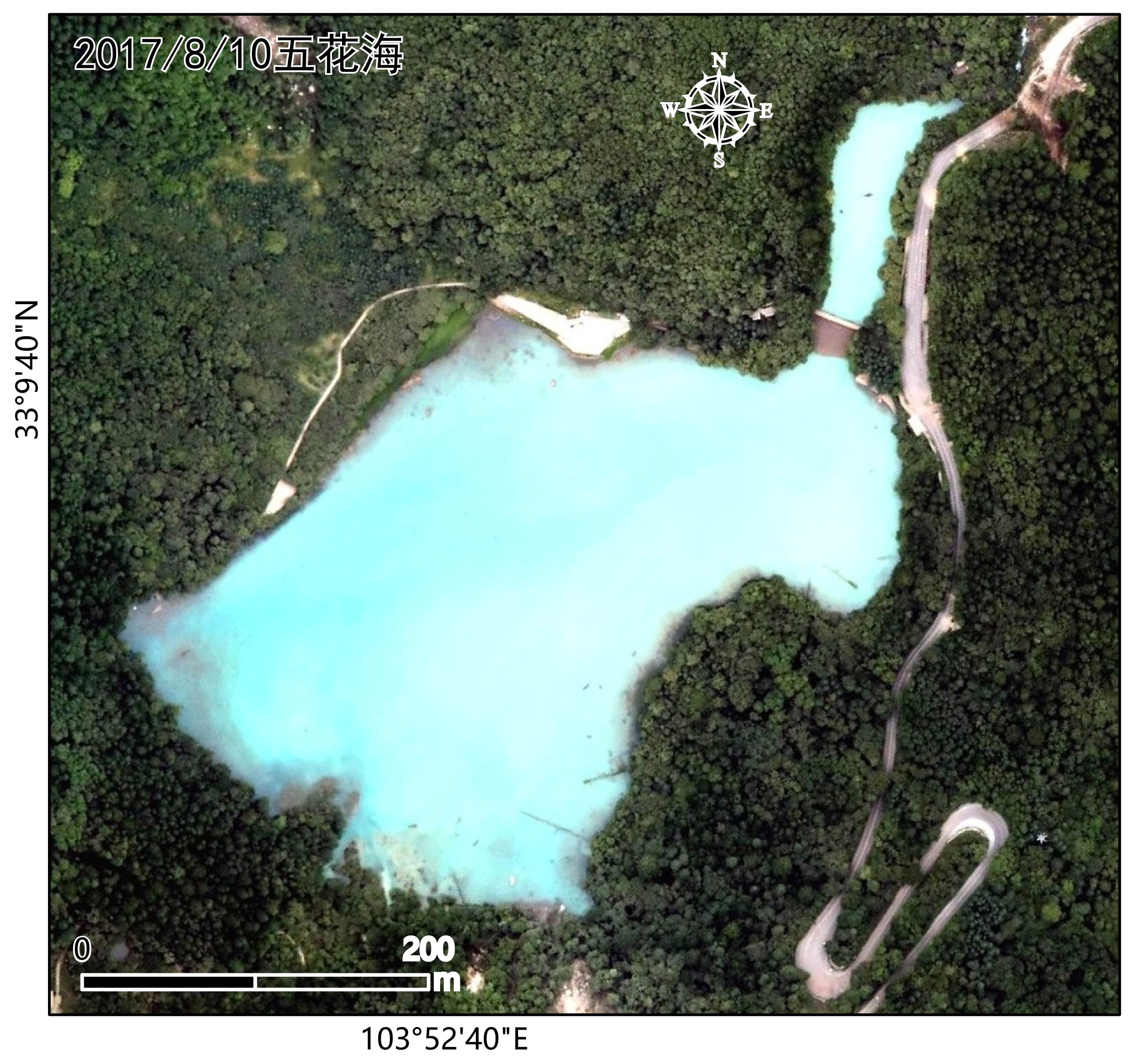 九寨沟地震发生后,诱发了大量同震滑坡,主要分布在日则沟,其中五花海的水体变得异常混浊(图2)。经过三年的恢复重建,海拔2472m的五花海形似一只开屏的孔雀,其长520m,最大宽度260m,面积8.47 公顷,在藻类和钙华等多种因素共同作用下,湖水色彩丰富。五花海湖水较浅,其底部藻类中的叶绿素对太阳光的反射和红光散射作用比较强烈,显示出五彩斑斓的色彩(图3)。
