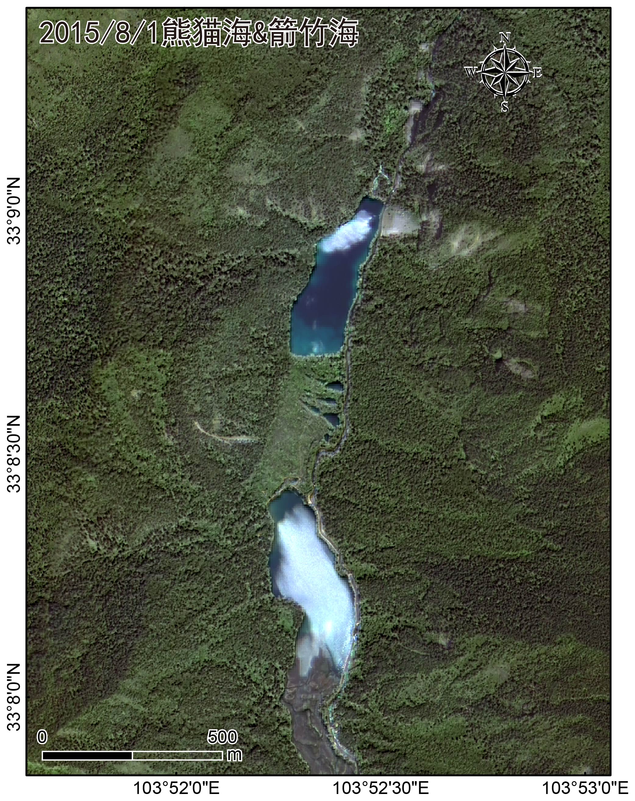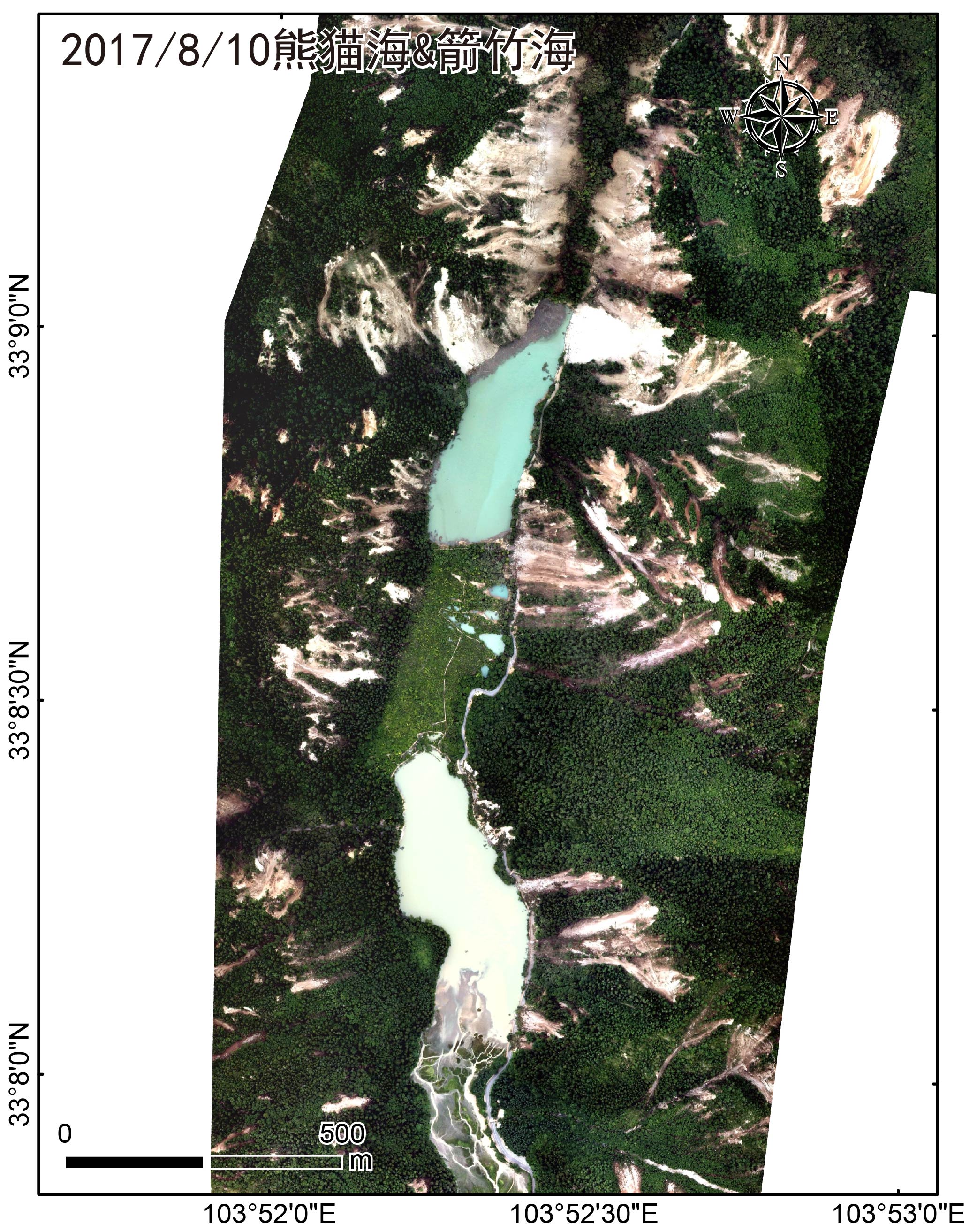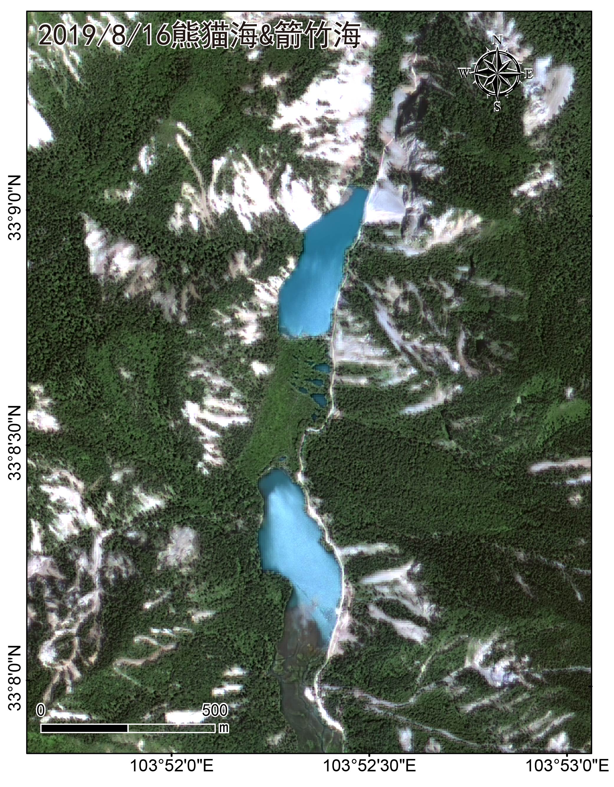 图4 地震前(2015年8月1日)的影像显示,熊猫海与箭竹海美丽宁静的水体景观(左);地震刚发生后(2017年8月10日)影像显示,周边区域遭受滑坡等地质灾害严重破坏的熊猫海与箭竹海水体异常混浊(中);震后两年(2019年8月16日)的遥感影像显示,熊猫海与箭竹海的水体逐渐恢复清澈(右)