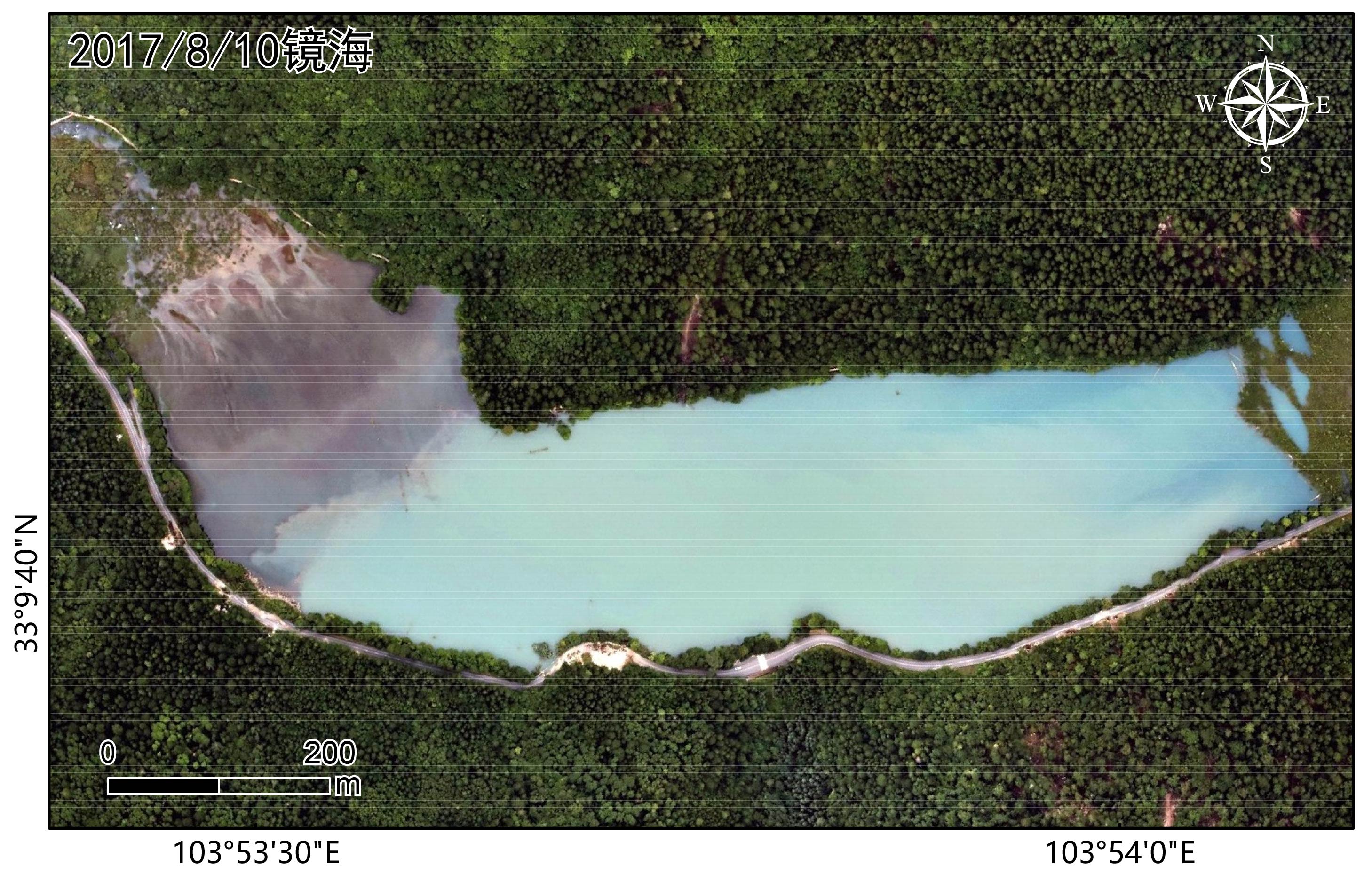 图5 地震刚发生后(2017年8月10日)的影像显示,镜海的水体混浊(左);地震近三年后(2020年6月9日)的影像显示,镜海的水体逐渐恢复其湛蓝色(右)