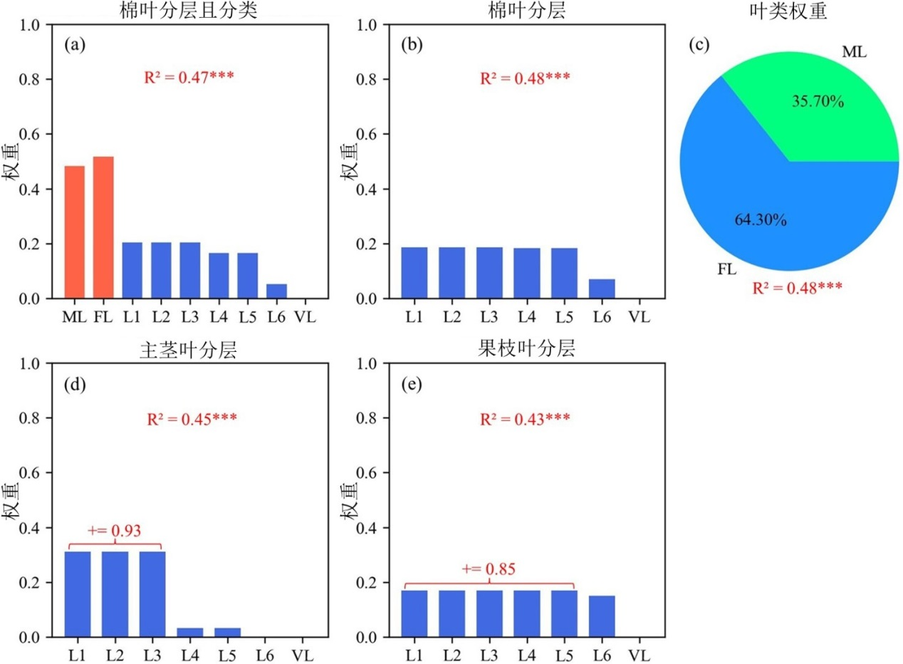 图1 棉花叶片分层或分类病情与产量的响应权重:(a)分层且分类;(b)分层;(c)分类;(d)主茎叶分层;(e)果枝叶分层;显著水平: *** (p < 0.001)