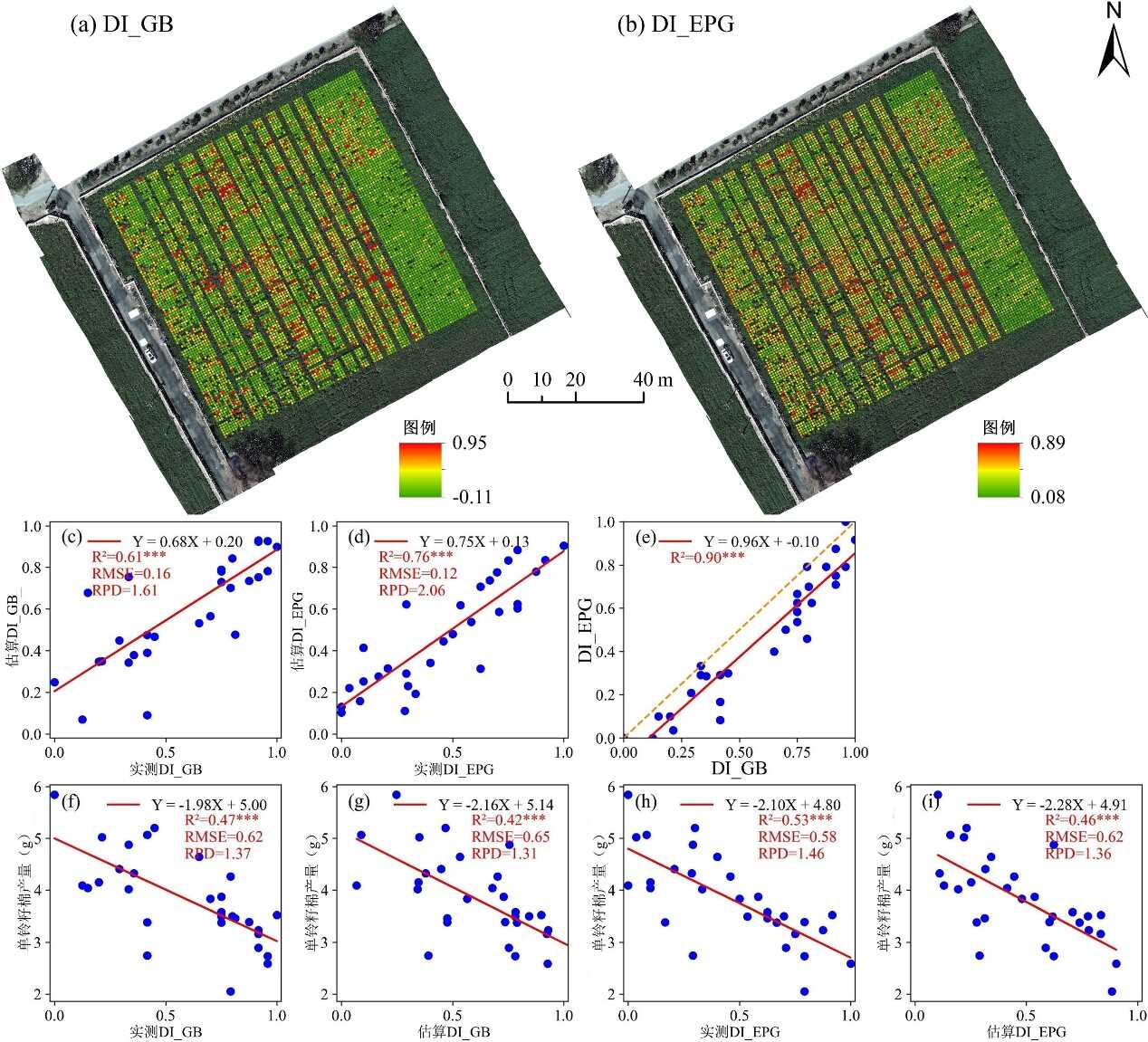 图5棉花DI_GB和DI_EPG的遥感估算结果:(a)和(b)为DI_GB与 DI_EPG的估算结果;(c)和(d)为DI_GB与DI_EPG的精度评价;(e)DI_EPG相对于DI_GB的优化;(f)-(i)分别为实测DI_GB、估算DI_GB、实测DI_EPG和估算DI_EPG与单铃籽棉产量的线性关系