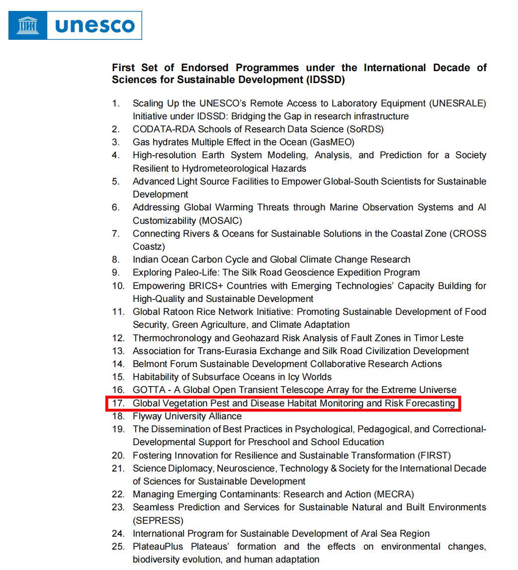 近日,中国科学院空天信息创新研究院(空天院)牵头的病虫害国际计划“Global Vegetation Pest and Disease Habitat Monitoring and Risk Forecasting”入选联合国“科学促进可持续发展国际十年(2024-2033)”(简称“科学十年”,英文IDSSD)首批倡议清单。在首轮申请中,全球仅有25项计划获得联合国教科文组织(UNESCO)正式认可,入选结果已于5月7日在“第十届联合国科技创新促进可持续发展目标多利益攸关方论坛”(STI Forum)上正式公布。