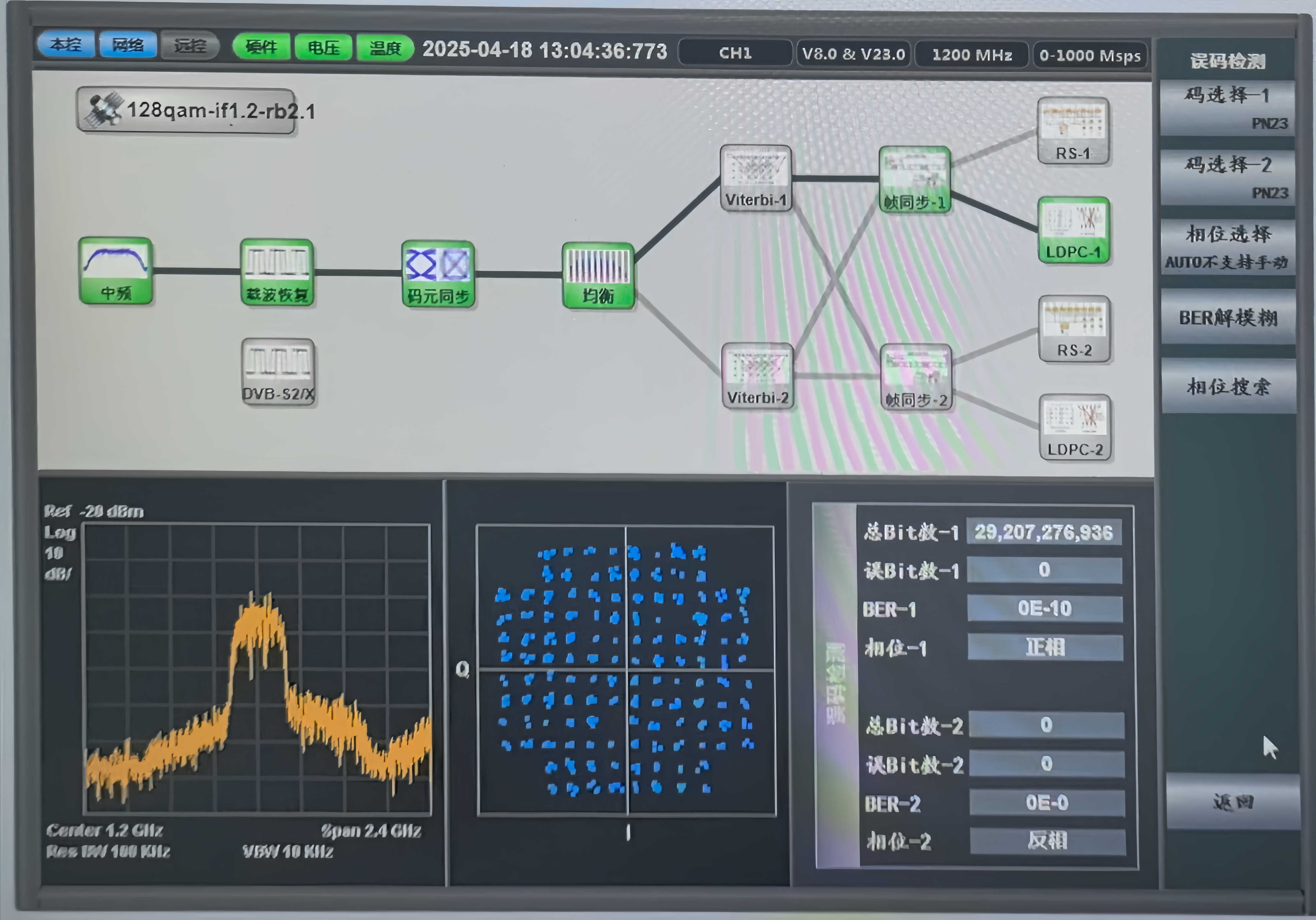 实验项目负责人、空天院高级工程师张雨濛介绍,三个阶段的实验结果表明,利用地面系统现有信道设备配合新研制的高阶体制调制解调器,在128QAM高阶体制下,可实现X频段2100Mbps单通道码速率通信,星座图无明显畸变,误码率可归零,充分验证了高阶体制高码率数据传输的技术可行性。