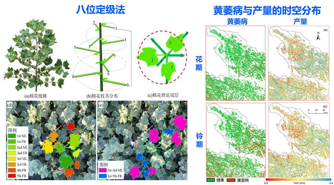 项目针对当前棉花黄萎病监测存在的难以实现大面积早期快速诊断、病情分级方法与产量脱节等突出问题开展研究,取得多项原创成果,得到国内外同行广泛关注与认可:一是,建立了面向棉花黄萎病监测的通量-荧光-光谱-物候协同观测塔,首次绘制了全疆多年10米分辨率高精度棉田分布图;二是,提出一种实用的冠层SIF生理与非生理组分解耦方法,厘清黄萎病胁迫下显微结构-叶片-冠层图谱及荧光响应机制,构建了耦合生理与形色多“症状”特征的黄萎病遥感早期监测方法;三是,创新性提出关联产量损失的棉花黄萎病病情实用分级方法,揭示了沙漠增温效应驱动新疆绿洲生态系统棉花黄萎病爆发的时空分布规律;四是,提出基于卫星SIF逐级空间降尺度及时空预测网络的棉花产量估算新方法。