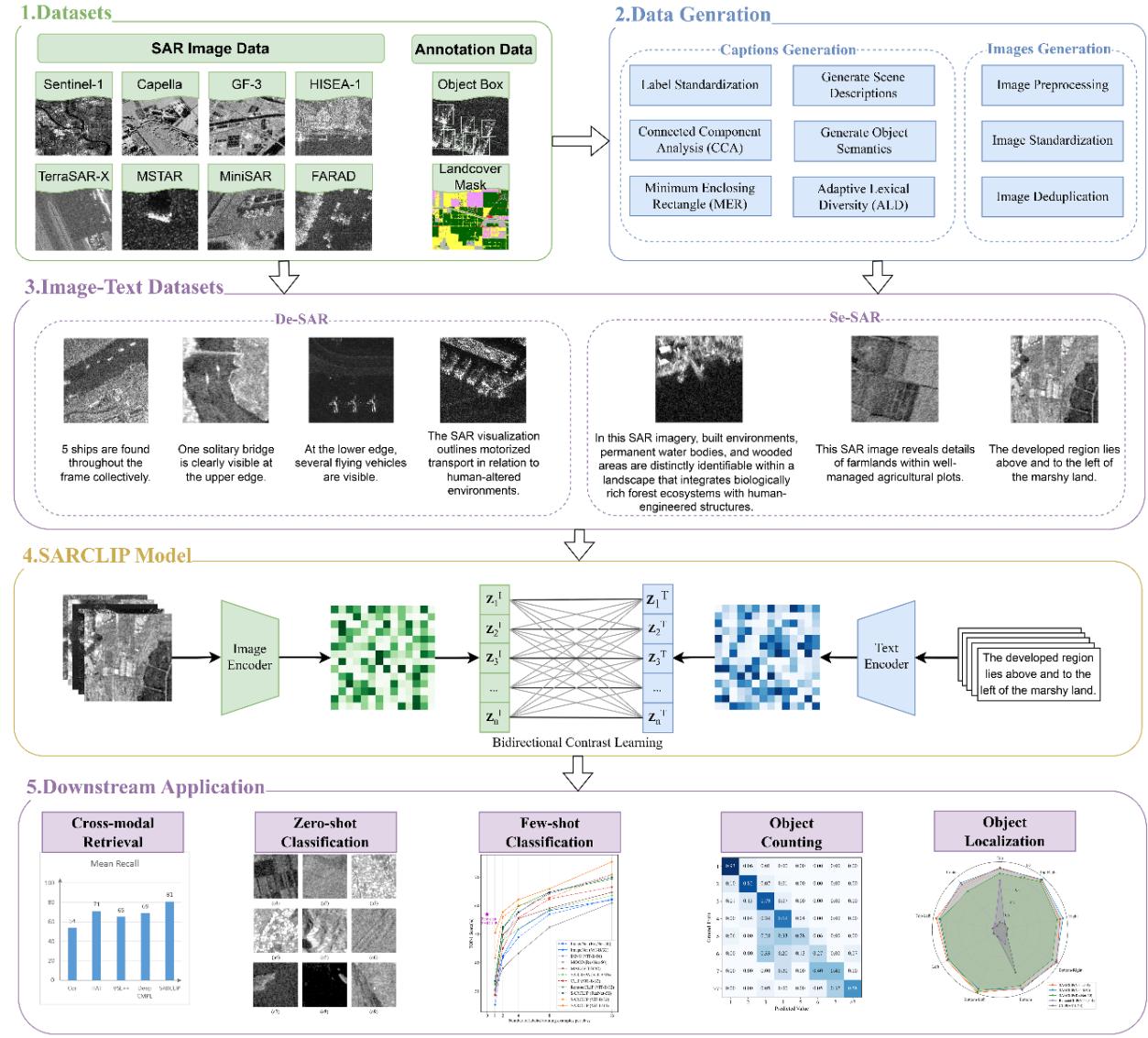 图1 SARCLIP 框架在数据收集、训练与下游应用中的整体概览