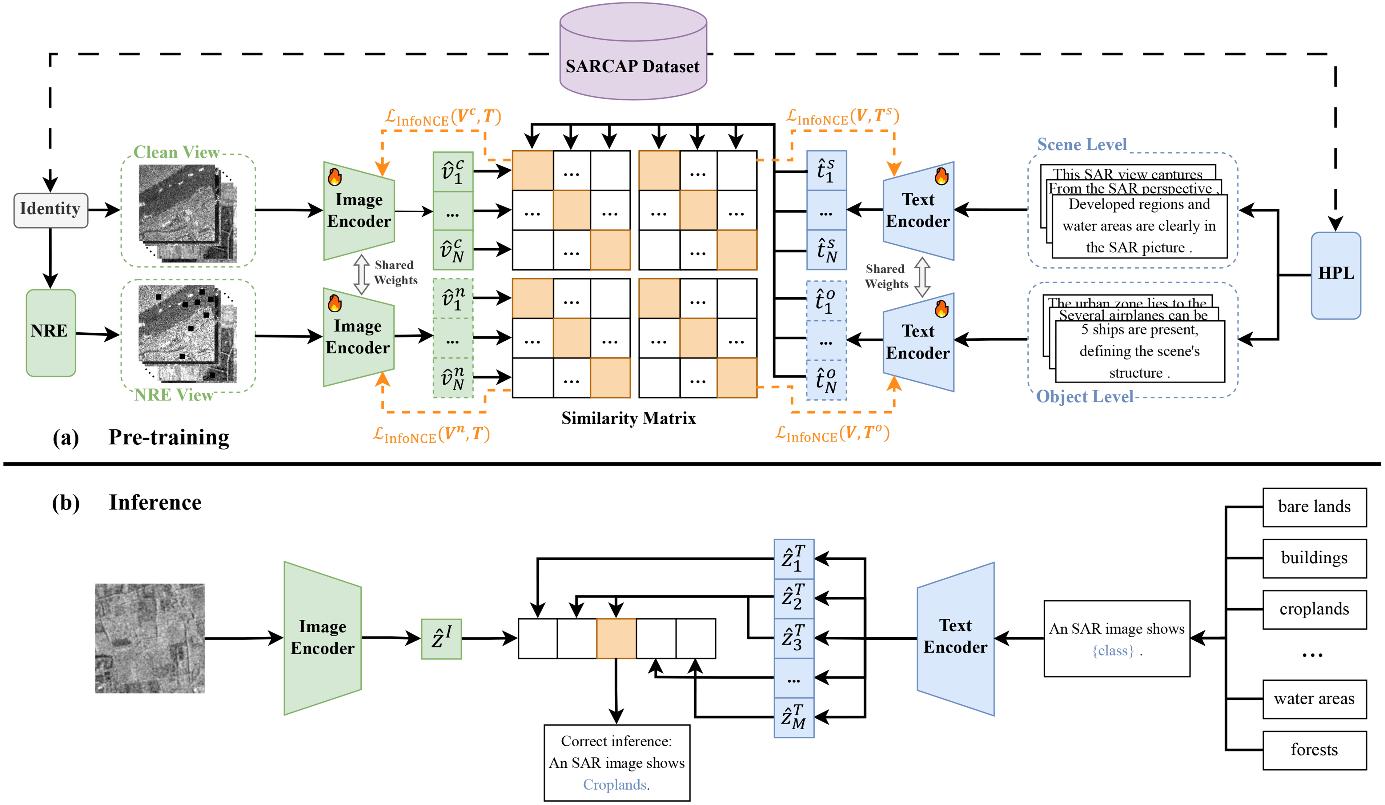 图3 SARCLIP 的 SAR 特定预训练与推理框架。(a) 预训练框架。(b) 推理框架