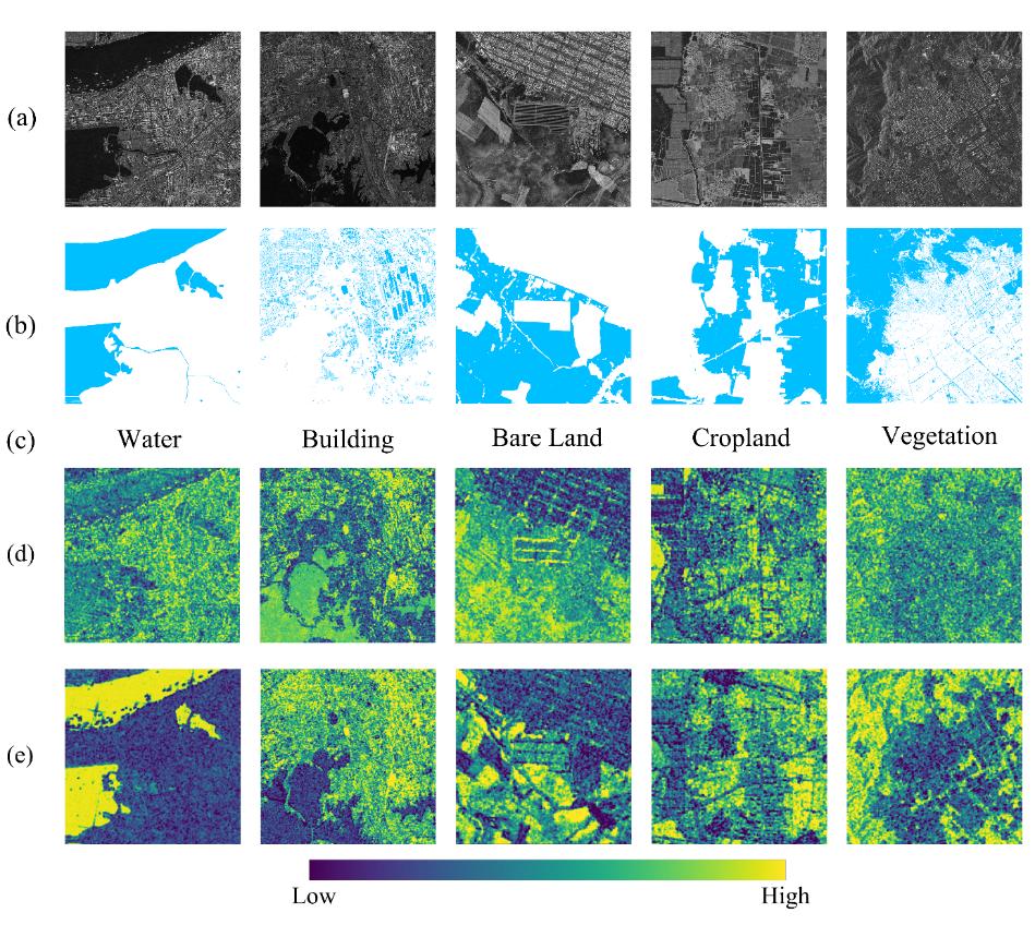 图5 消融实验中的图文相似度可视化结果。(a) 输入 SAR 图像,(b) 参考标签,(c) 文本提示,(d) 未使用 HPL 的 SARCLIP 相似度图,(e) 使用 HPL 的 SARCLIP 相似度图。颜色条表示相似度分数