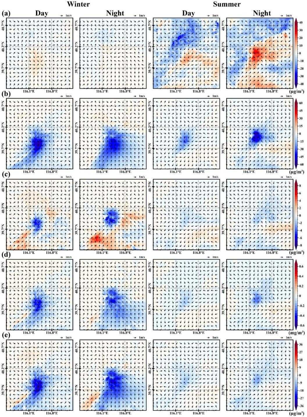 图1 人为热导致近地面浓度变化示意图:(a) O₃、(b) NO₂、(c) SO₂、(d) CO及(e) PM2.5。箭头表示10米高度风向变化的归一化矢量。