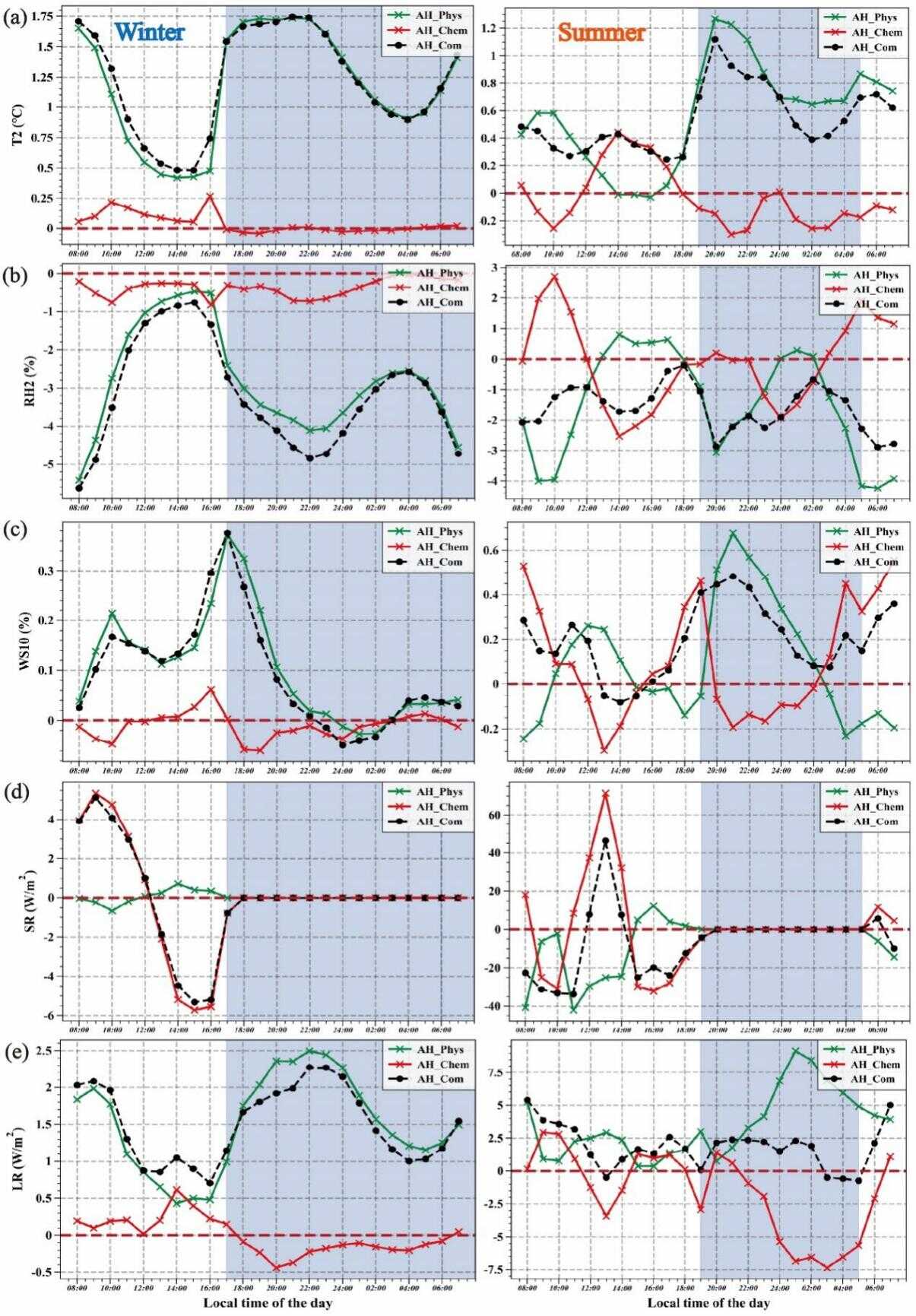 图3 人为热排放的综合影响(AH_com)、直接物理影响(AH_phys)和间接化学影响(AH_Chem)对(a)2米气温(T2)、(b)2米相对湿度(RH2)、(c)10米风速(WS10)、(d)短波辐射(SR)和(e)长波辐射(LR)的影响。