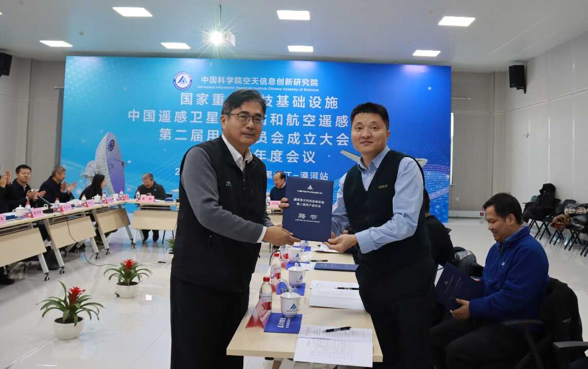 空天院科技处牛云峰主持会议,宣读用户委员会名单,宣布第二届设施用户委员会正式成立。吴一戎代表空天院向到会委员颁发聘书,并希望用户委员与空天院进一步合作交流,推动设施更好服务国家战略、贡献全球发展。