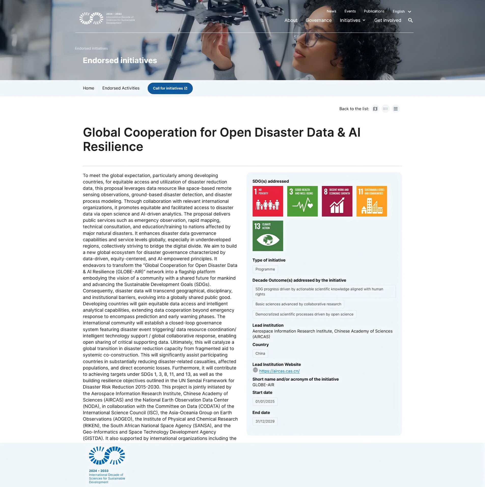 近日,由中国科学院空天信息创新研究院(空天院)牵头申报的“数据开放与智能普惠减灾合作”(GLOBE-AIR)国际计划正式入选联合国教科文组织“2024-2033年可持续发展国际科学十年”(IDSSD,简称“科学十年”)倡议,成为全球推动可持续发展科学行动的重要组成部分。
