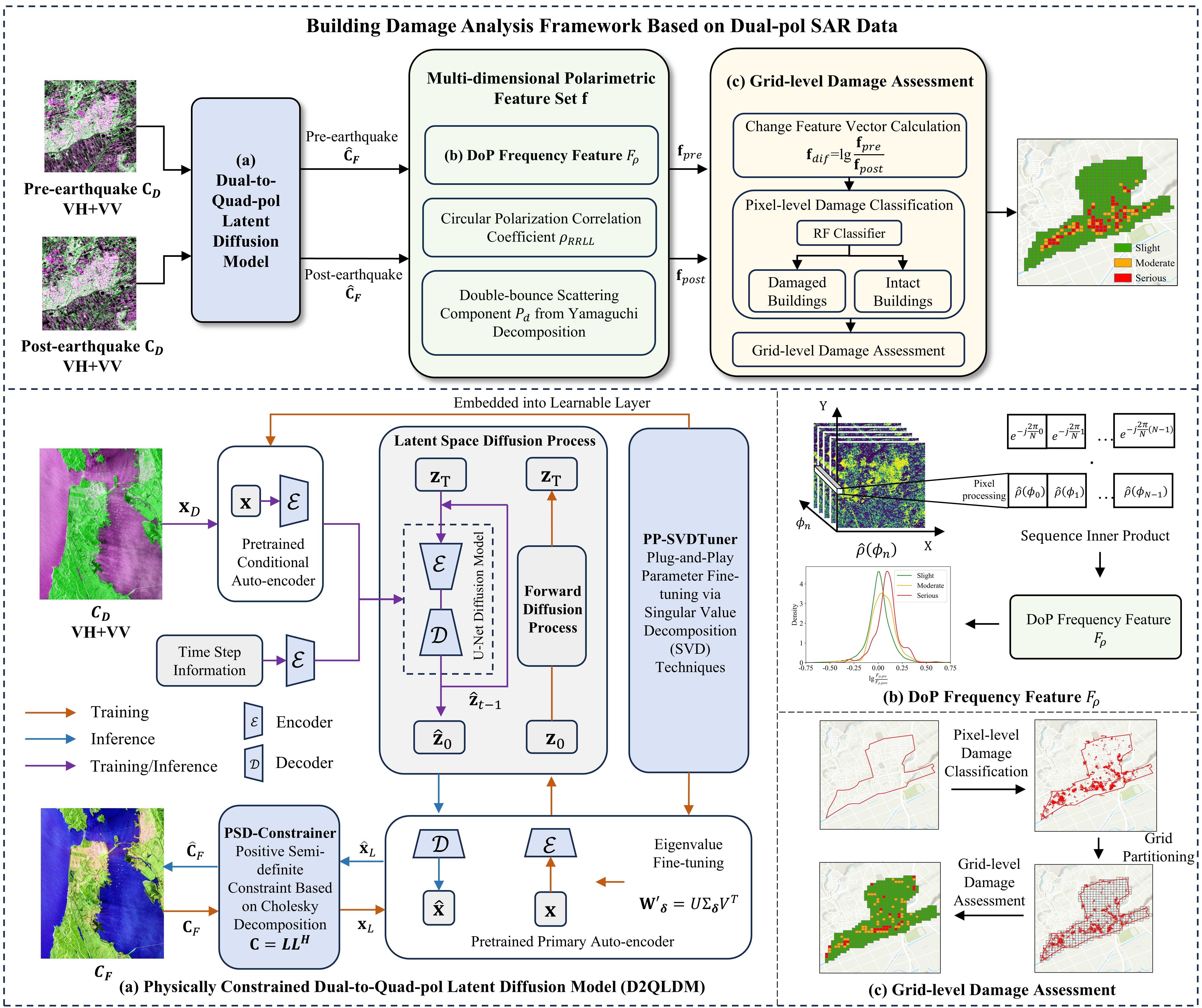 D2QLDM模型在保持对数学物理性质严格约束的基础上,创新性引入即插即用的SVD参数微调模块,通过动态优化参数,以较少计算代价显著提升了重建精度。并且,研究团队还提出了一种基于Stokes矢量的极化度频率特征分析方法,能更敏感地捕捉震后建筑倒塌所引发的去极化效应。