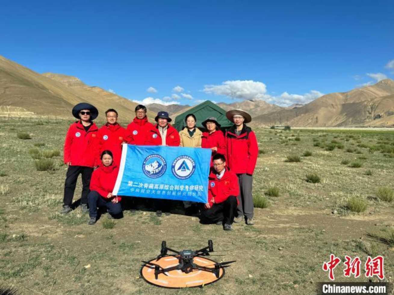 8月1日,作为二次青藏科考一项重要组成部分,珠峰地区首次开展航空平台水-热-碳通量观测试验正式启动,图为参加试验任务的科考队员代表合影。中新网记者 孙自法 摄