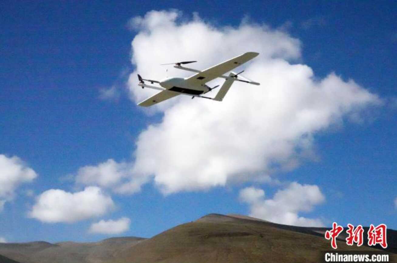 8月1日,作为二次青藏科考一项重要组成部分,珠峰地区首次开展航空平台水-热-碳通量观测试验正式启动,图为参加试验任务的无人机起飞开展观测。中新网记者 孙自法 摄