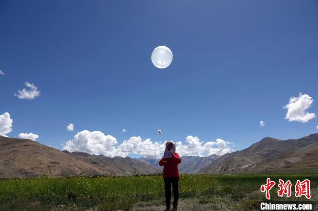 8月1日,作为二次青藏科考一项重要组成部分,珠峰地区首次开展航空平台水-热-碳通量观测试验正式启动,图为科考队员施放观测气球。中新网记者 孙自法 摄