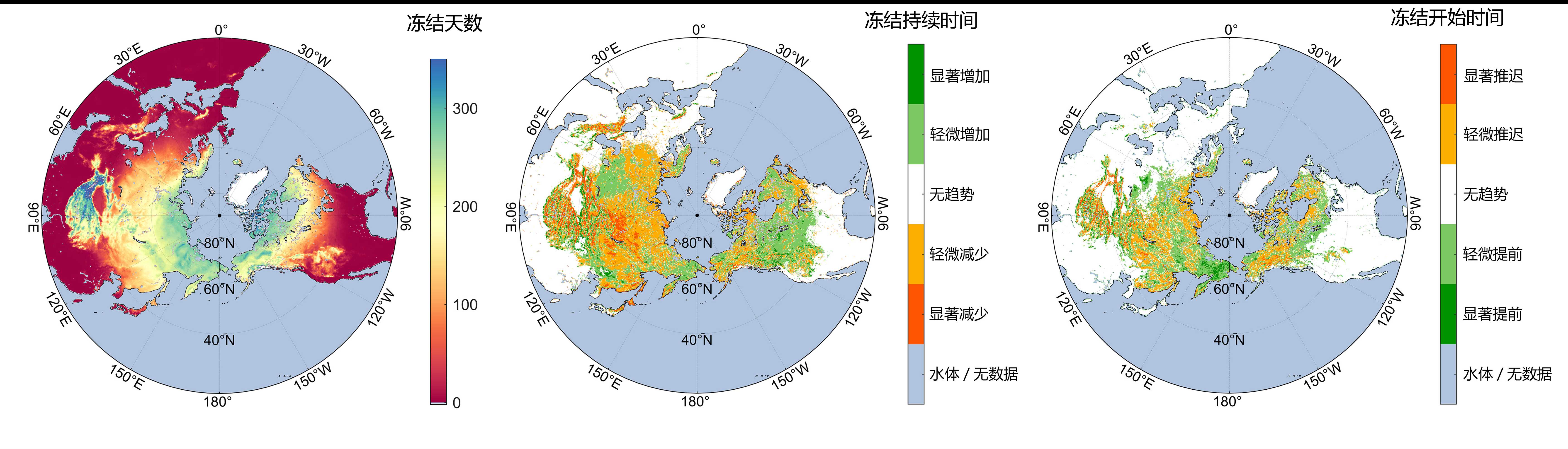 土壤冻融循环还如同调控农业与生态物候的“隐形开关”,其变化直接影响着春季植被返青、农作物播种等关键物候节点。基于该数据集的分析发现,21世纪以来,北纬45度以北地区,约14.35%的区域土壤冻结持续时间明显缩短,约9.1%的区域冻结开始日期明显推迟。这一变化可能改变作物的适宜播种期,影响自然植被的返青时序,并重新分配生长季内的水分与养分。这些精细观测数据,为预测农业气候适宜性、评估生态物候变化、指导农业生产提供了科学支撑。