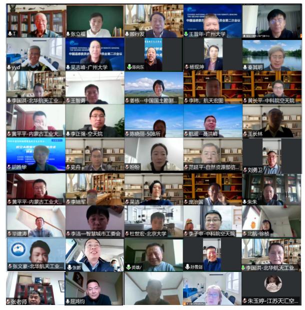 中国遥感委员会名誉主席童庆禧院士、主席顾行发研究员,副主席中国气象学会卫星气象学委员会杨军研究员、广州大学王晋年教授、中国地理学会环境遥感分会朱博勤研究员、中国地质学会遥感地质专业委员会聂洪峰主任、二十一世纪空间技术应用股份有限公司王智勇总经理,副主席兼秘书长、中国科学院空天信息创新研究院张立福研究员以及委员会委员共46人参加了线上会议。张立福主持会议。