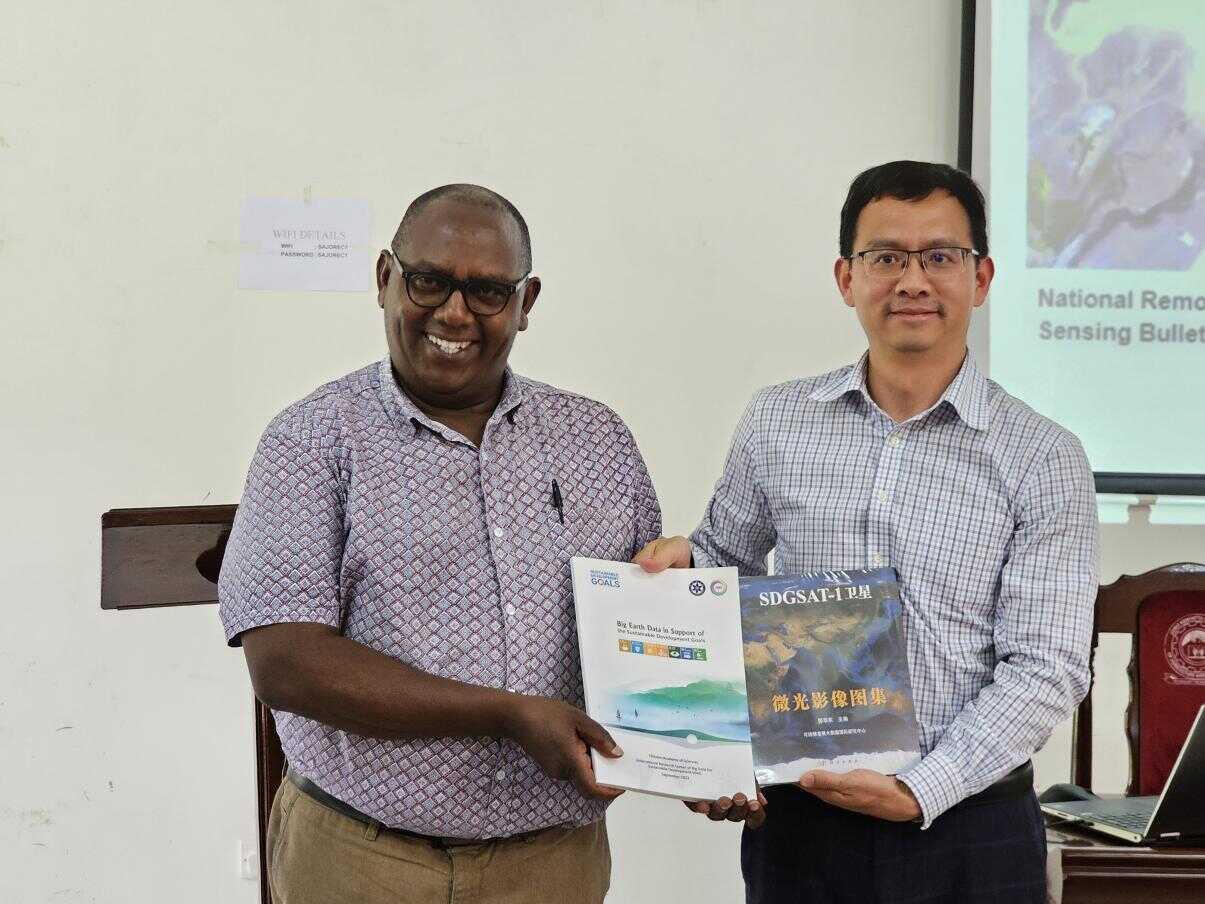 卢善龙向Gituru Robert赠送《地球大数据支撑可持续发展目标报告(2023)》与《SDGSAT-1卫星微光影像图集》