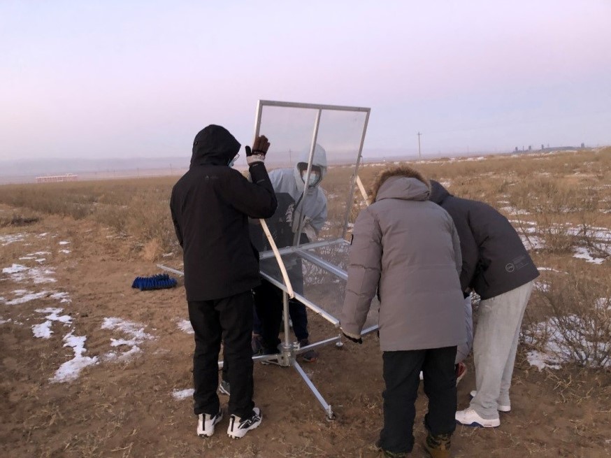 试验中,科研人员克服了外场严寒恶劣条件,在人工固定靶标场周边安装部署了16个边长1米的方形二面角和三面角SAR角反射器;大面积沙地及周边共计布设了36个不同规格的二面角和三面角SAR角反射器,并进行角度调校,完成SAR载荷定标任务;在定标场环形跑道内设置三辆匀速行驶汽车作为移动目标,用于测试SAR载荷对移动目标的检测能力。