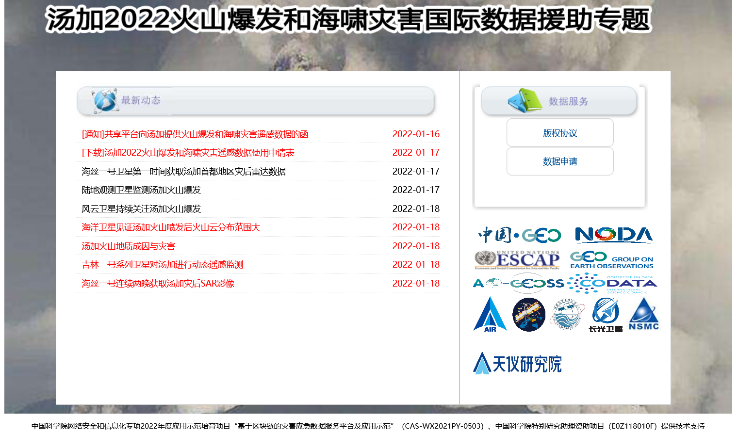 1月16日,应联合国亚洲及太平洋经济社会委员会(UNESCAP)、南太平洋委员会(SPC)和新西兰减灾机构请求,依托空天信息创新研究院建设的国家综合地球观测数据共享平台第一时间启动中国对地观测组织(ChinaGEO)灾害数据应急响应机制(ChinaGEO Disaster Data Response,CDDR),紧急协调天仪研究院、长光卫星技术有限公司、国家卫星海洋应用中心等机构对受灾最严重的努库阿洛法等地区安排应急观测任务。这是国际上第一个针对该事件的数据应急行动。