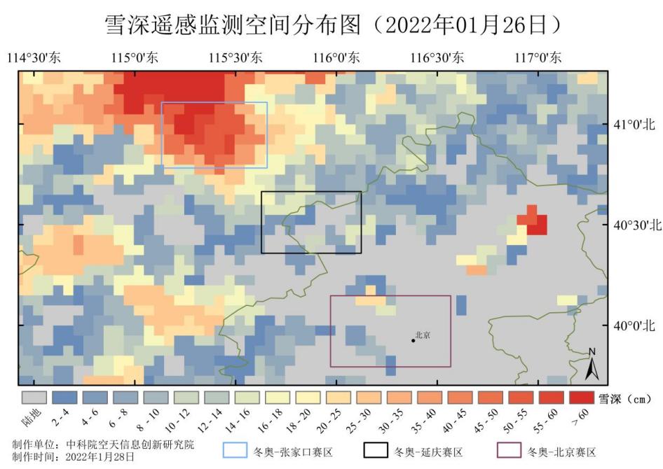 自2021年底至2022年2月中下旬,科研团队累计提供连续逐日监测数据,分别有效服务冬奥会赛区及周边积雪监测3次,报送东北及华北区域雪情卫星遥感监测7次,中东部地区及南方地区雨雪冰冻监测4次。
