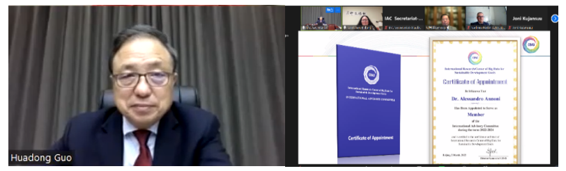 SDG中心主任郭华东院士向国际咨询委员会委员在线颁发了聘书。郭华东指出,SDG中心致力于为解决我国和全球重大可持续发展问题提供基础理论、技术方法、决策支持和智库服务支撑,希望各位委员为SDG中心的国际发展贡献智慧,不断探索通过科技创新应对全球和区域可持续发展挑战的途径,实现优势资源的深度融合。