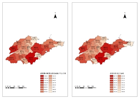 左图为山东省各市可配置建筑物面积,右图为山东省各市总发电量