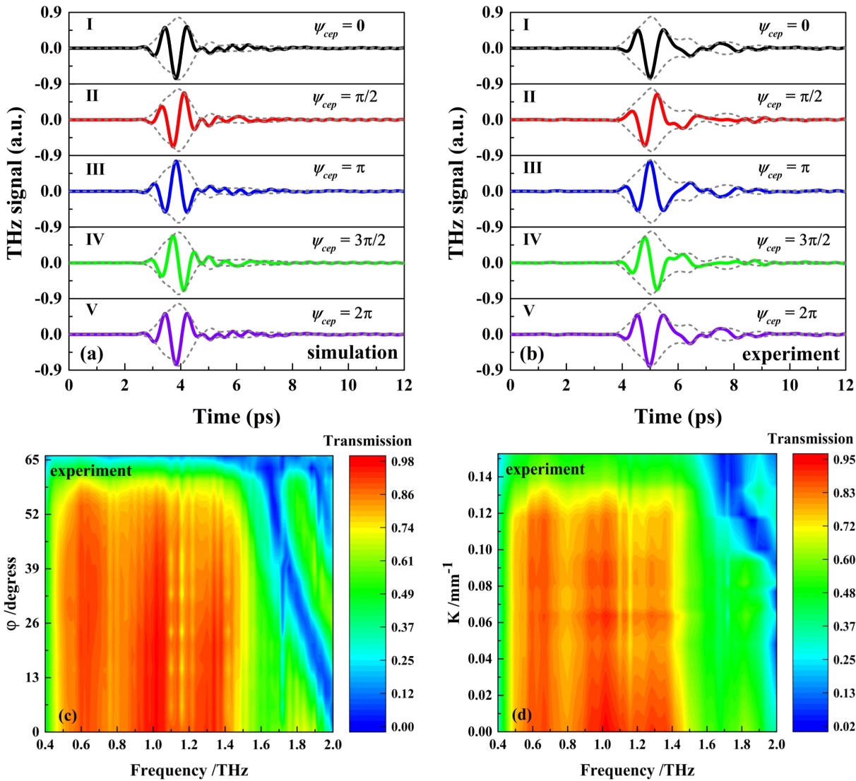 基于此,研究团队提出了基于超材料的柔性THz载波包络移相器来控制THz CEP的方法,并对该移相器的性能进行了模拟和实验表征。研究者利用特定的金属分裂环谐振器的几何相位和共振相位来控制THz脉冲的CEP,并利用正交定向光栅来提高传输效率。当入射的THz脉冲依次被载波包络移相器中不同的微结构阵列调制时,通过THz时域光谱系统(THz-TDS)清晰地观察到了THz脉冲的时间波形在不同CEP值下的变化,与模拟结果十分吻合(图2a, b)。此外,通过实验验证了该移相器在广角入射和大的形变下具有良好的鲁棒性(图2c, d)。通过适当缩放模型的结构参数,该设计方案也可以应用于其他波段。