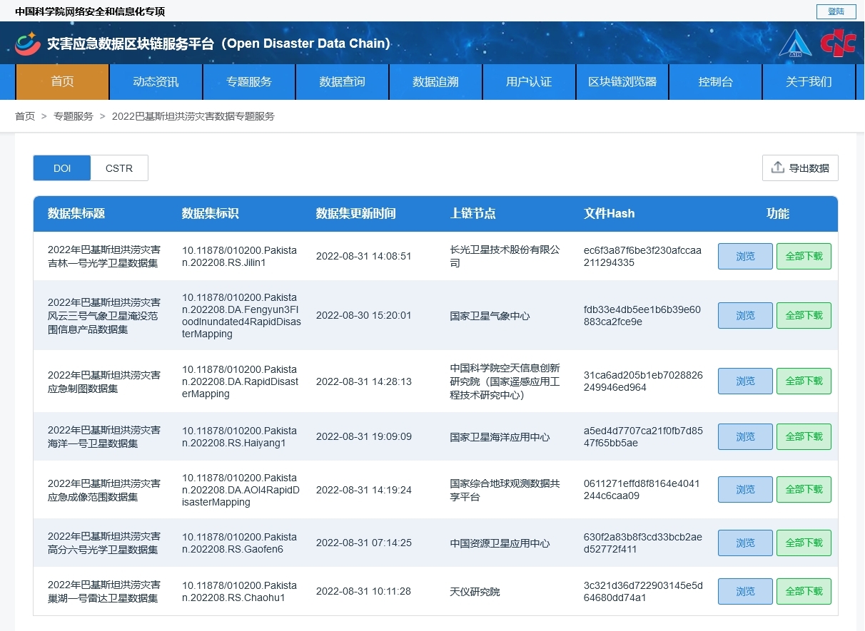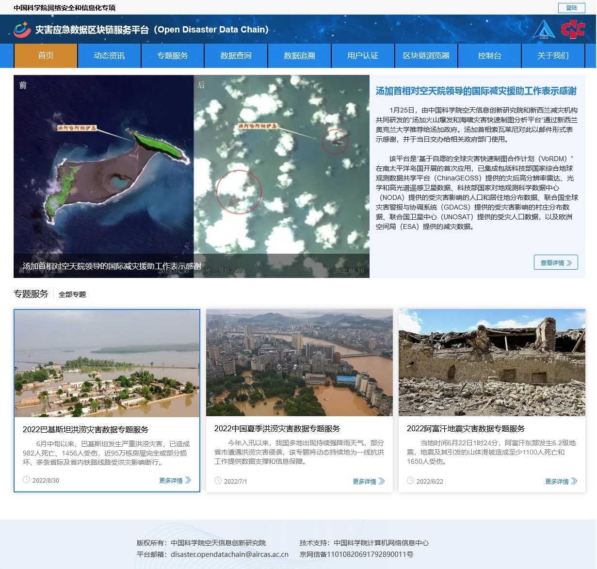 在中国科学院网信专项培育项目“基于区块链的灾害应急数据服务平台及应用示范”支持下,灾害应急数据区块链服务平台采用我国首个获得国家网信办区块链信息服务备案编号的科学数据区块链——开放数据联盟链(ODC)作为底层开发平台,采用多子链分布协同的技术架构,初步构建了覆盖我国主要减灾机构的区块链可信联盟体系,具有快速部署、高性能智能合约、多平台兼容等创新优势,为解决灾害应急过程中的数据确权凭证、版本管理、可信共享和溯源追踪等问题开辟了“区块链+”服务新模式。