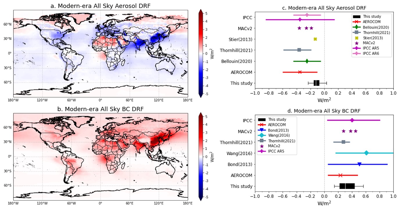 研究表明,当前全球的气溶胶吸收光学厚度(mid-visible)估计在0.0070, 95%置信区间[0.0068,0.0073],三种主要的吸收性气溶胶成分贡献分别为:黑碳(0.0055)、有机气溶胶(0.0007)以及沙尘(0.0008)。研究估计出人为排放对气溶胶吸收的贡献为72.9%[58.2%,79.8%], 而黑碳气溶胶人为排放的贡献高达80.3%[65.9%,88.9%]。这些结论普遍高于第五次与第六次IPCC 评估结果1.3到1.8倍,表明由人类活动引起的气溶胶吸收及其对环境健康和气候的效应需要得到更多的关注和精准的评估。研究进一步评估了气溶胶瞬时直接辐射强迫为-0.14 W/m2 [-0.25,+0.01],其中黑碳直接辐射强迫估计在+0.33 W/m2 [+0.17,+0.54]。总体而言,此项研究证明通过更加先进的遥感观测手段,如多角度偏振遥感,可以得到更准确的气溶胶细节特性的大尺度空间分布,并进一步约束气溶胶气候效应研究。