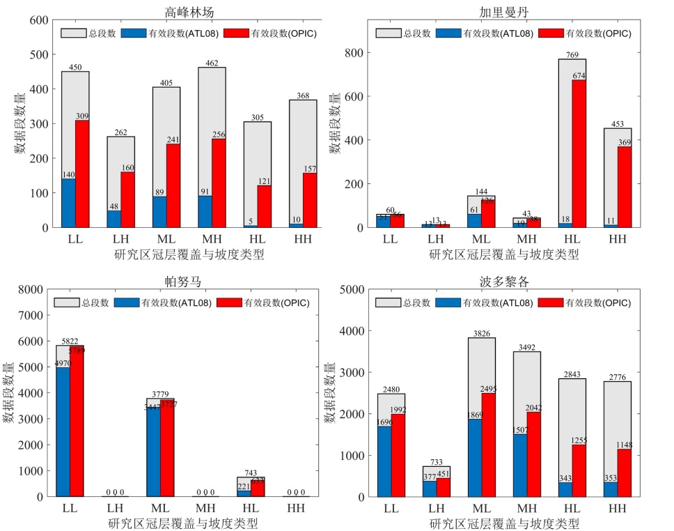 在高、中、低冠层覆盖度与高、低地形坡度组合的不同场景下,OPIC算法提供的有效数据明显多于ATL08产品。在最具挑战性的高冠层覆盖场景(HL、HH)中,其优化效果尤为明显,如在以亚热带人工林为主的高峰林场,经OPIC算法优化后的数据有效利用率从仅有的2.2%(15段)提升到41%(278段);以高森林覆盖度为特色的加里曼丹热带天然林,ATL08产品的数据有效利用率只有2.4%(29段),经过OPIC算法优化后可以增加到85.4%(1043段);在帕努马研究区,OPIC可将数据有效利用率从29.7%提升至85.2%;在波多黎各热带林区,可将数据有效利用率从12.4%提升至42.8%。