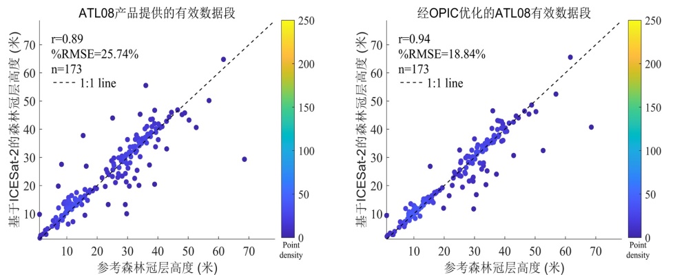 左图:ICESat-2官方产品精度,右图:OPIC算法优化后的估测精度