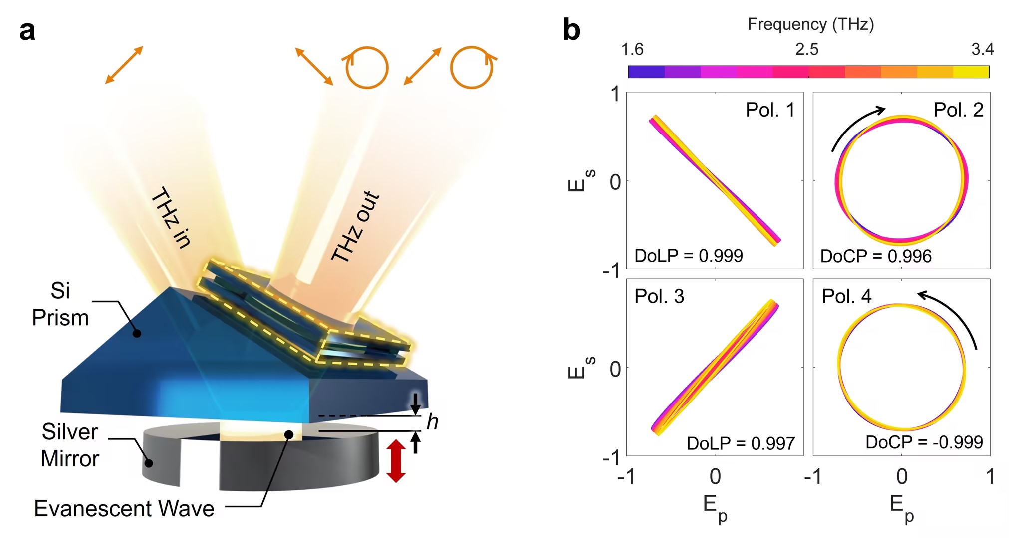 太赫兹多功能宽带偏振调制器。(a)为器件结构示意图,(b)为实验测得的四种偏振态输出。