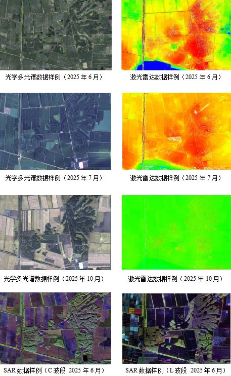 本次试验构建了覆盖广、精度高、维度全的航空观测数据获取体系,形成了多载荷、宽频谱、高分辨率的多时相航空遥感数据集,数据量达51.07TB。其中,光学多光谱数据最高几何分辨率达 0.08米,可清晰识别作物株型与田间细节;高光谱数据几何分辨率优于0.75米/1.5米(可见近红外波段/短波红外),光谱分辨率优于5纳米,可精准反演土壤有机质、作物叶绿素等关键参数;激光雷达数据点云密度优于5点/平方米,可高效获取农田地形地貌与作物三维结构信息;SAR数据几何分辨率优于1米,基于多波段与全极化联合,可实现作物类型精准识别与农情参数定量反演。