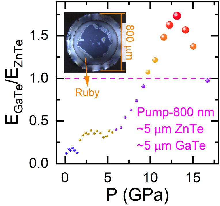 近期,大湾区空天信息研究院(大湾区院)与中国科学院合肥物质科学研究院固体所计算物理与量子材料研究部、北京高压科学研究中心等团队合作,利用搭建的高压太赫兹发射光谱系统,系统研究高压下半导体GaTe的太赫兹发射动力学和光电导动力学,观测到高压下发射强度的巨大增强以及发射时间的前移现象。