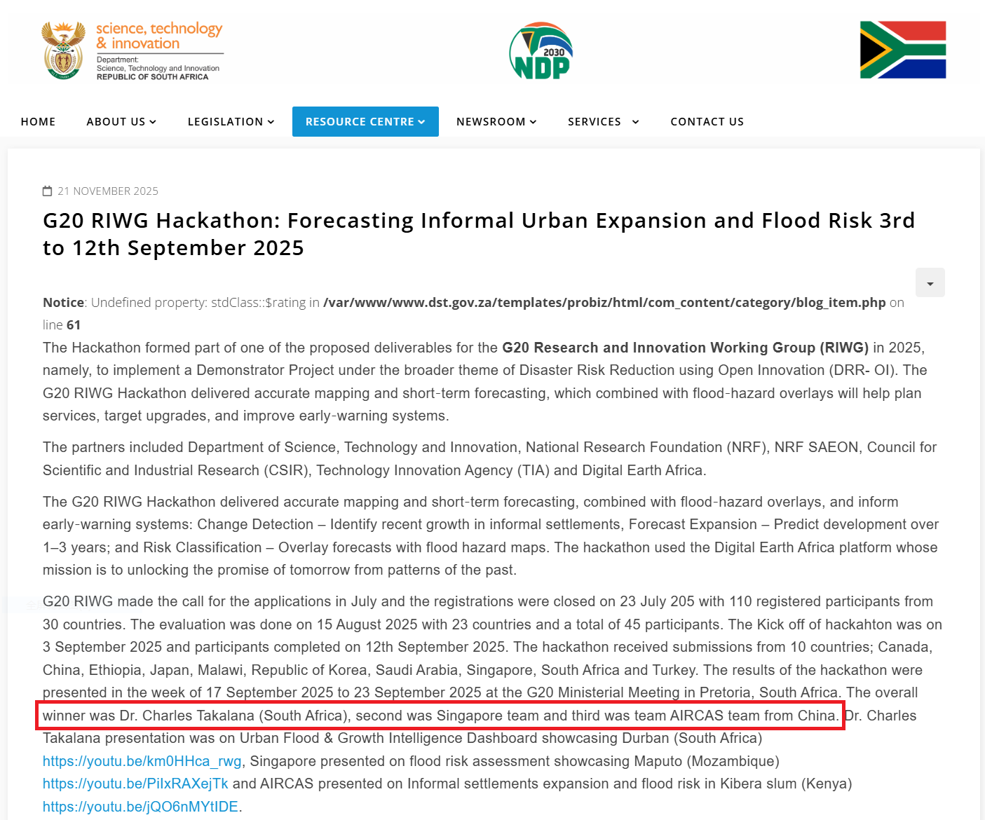 11月22-23日,在二十国集团领导人第二十次峰会(2025 G20峰会)重要背景下,G20研究与创新工作组(RIWG)于峰会前夕举办G20 RIWG 编程马拉松竞赛,由中国科学院空天信息创新研究院(空天院)一部与四室联合组成的AIRCAS参赛团队,凭借创新的技术解决方案,从全球30个国家的110名参与团队中脱颖而出,与南非、新加坡团队荣获“最佳解决方案奖”。