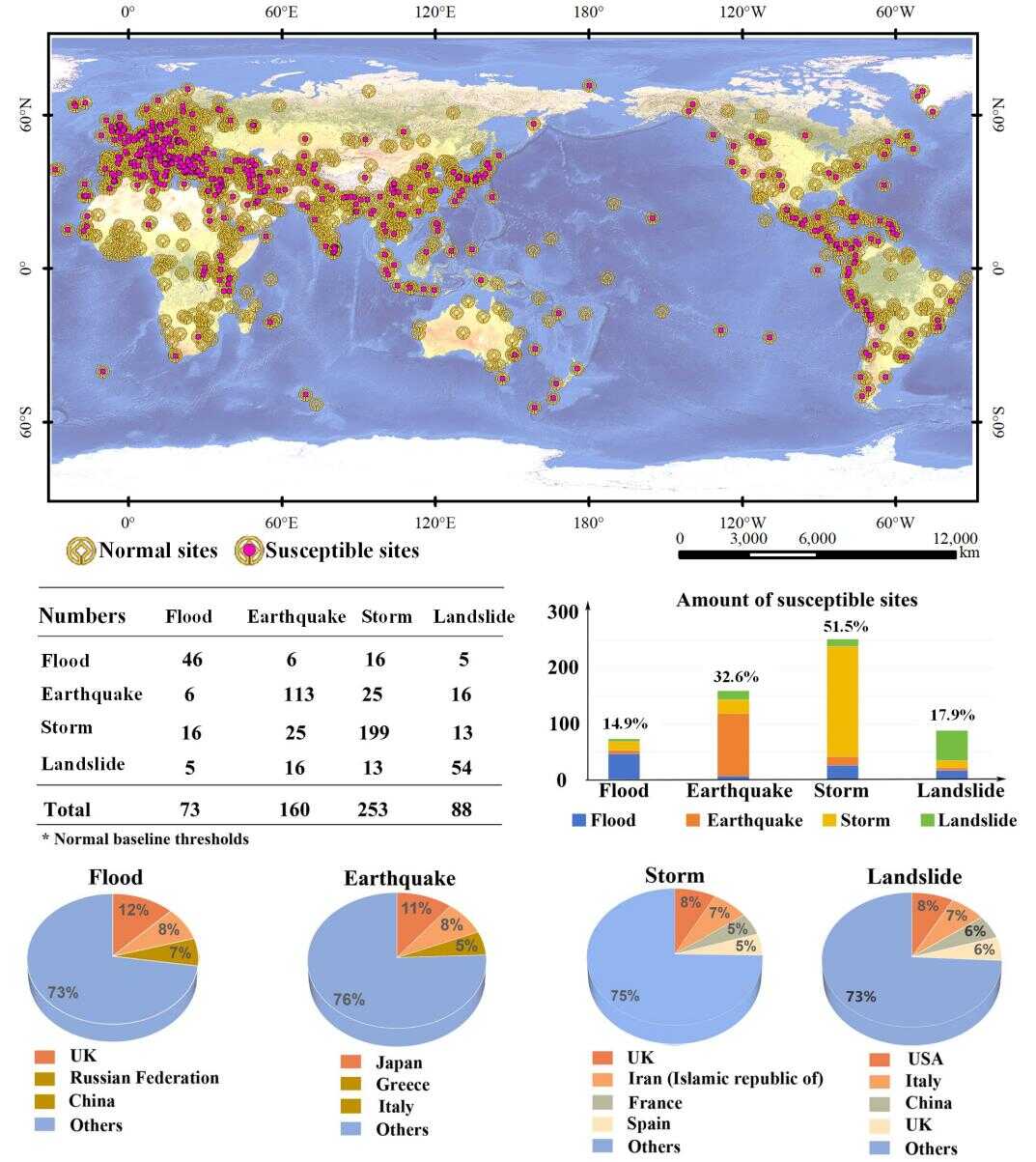 图1 洪水、地震、风暴和山体滑坡自然灾害全球世界遗产暴露度制图,以及灾害类型和暴露度的国家排序