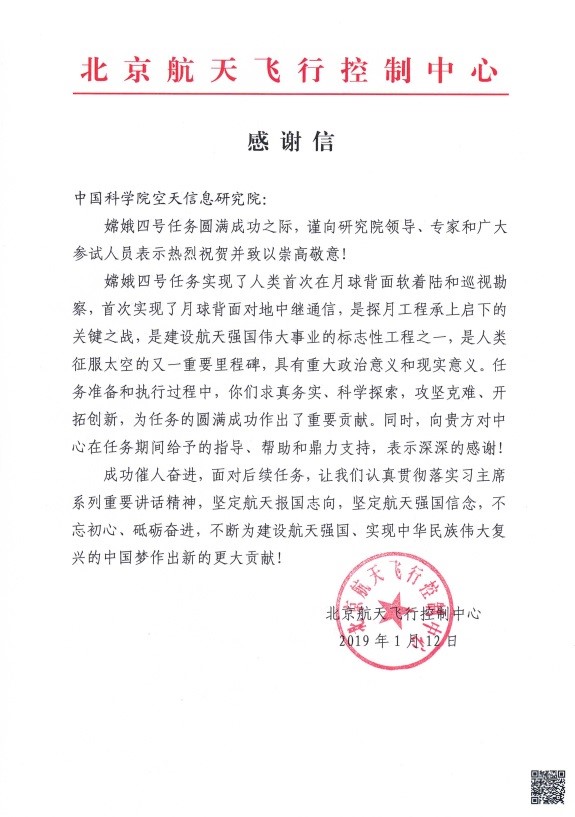 1月11日,嫦娥四号着陆器、玉兔二号巡视器顺利完成互拍成像,任务取得圆满成功,实现探月工程“五战五捷”。1月12日,北京航天飞行控制中心向中科院空天信息研究院(以下简称“空天院”)发来感谢信,感谢空天院嫦娥四号参试人员的辛勤工作和重要贡献,对空天院给予的大力支持表示衷心感谢。