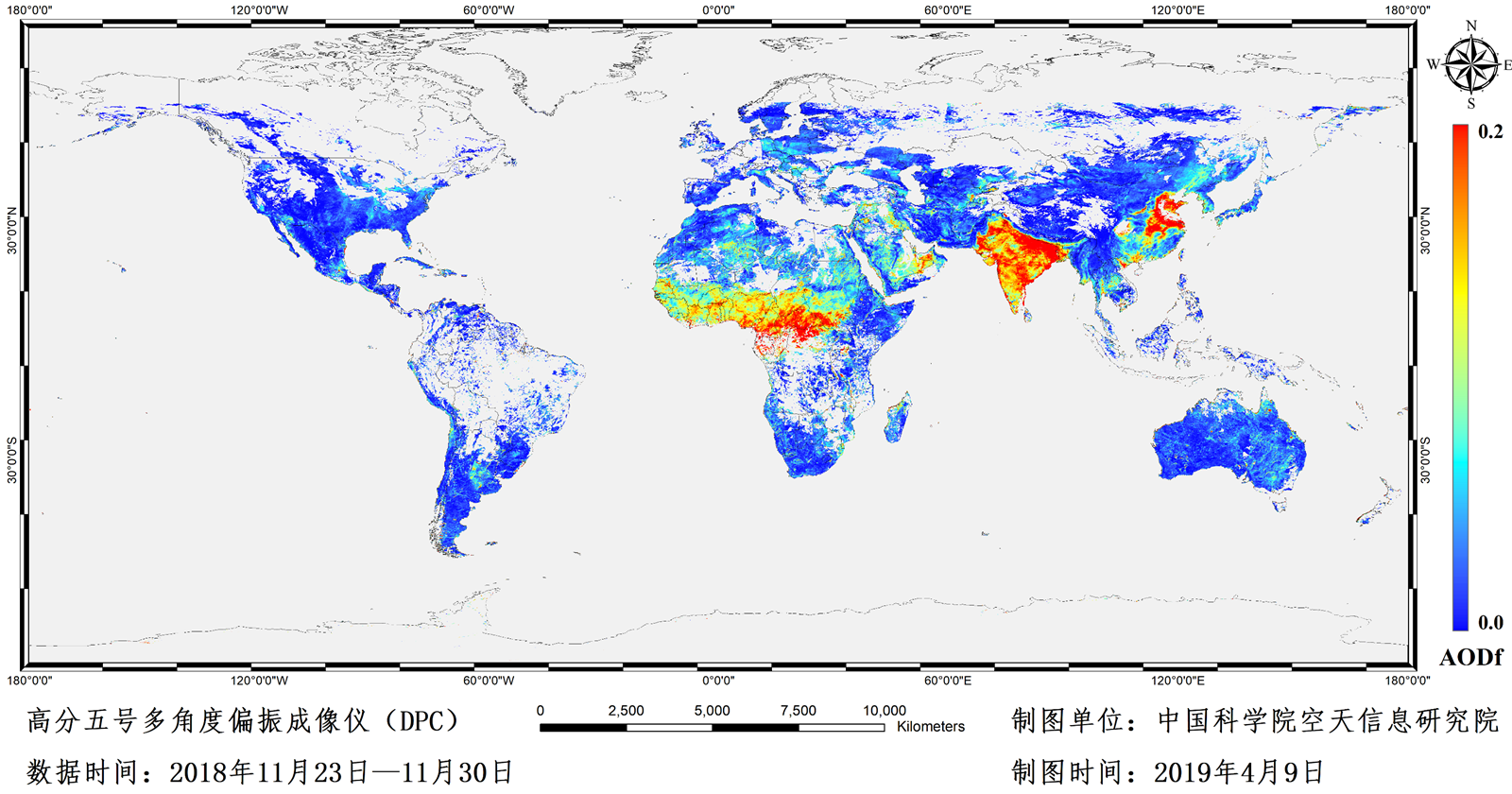 本报讯 近日,中科院空天信息研究院联合载荷研制单位中科院安徽光机所等机构,基于高分五号卫星上搭载的多角度偏振相机(DPC),获得了首幅全球3.3公里空间尺度的细粒子气溶胶光学厚度(AODf)分布图。这是国际上空间分辨率最高的AODf遥感观测数据集,可反映大气主要污染成分(PM2.5等)空间信息、为“解密”全球霾分布提供关键基础产品。