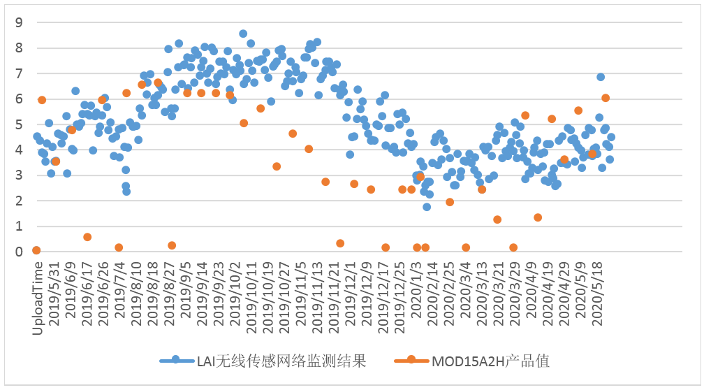 图5 LAI无线传感网络监测结果与MOD15A2H产品对比图(以禹城站为例)