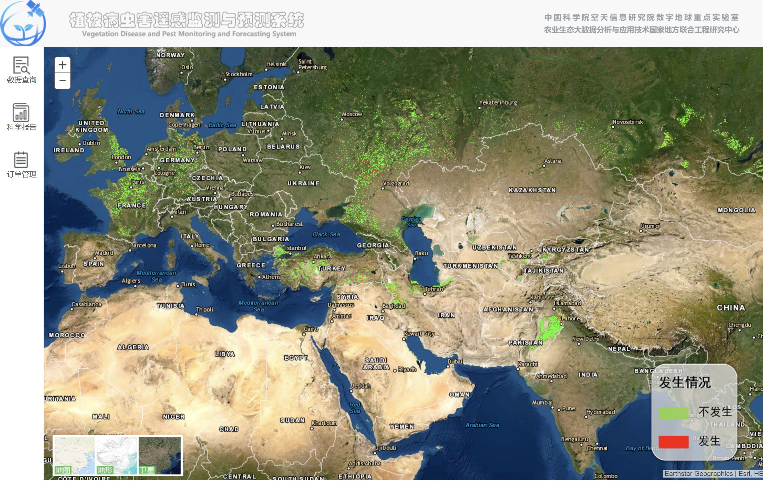 目前,空天院已通过该系统发布了92期全球、全国、粮食主产区和典型区域的《植被病虫害遥感监测与预测报告》,并针对当前肆虐亚非的沙漠蝗虫,发布了《亚非沙漠蝗虫灾情监测与评估报告》专题。相关成果被科技部、农业农村部、国家林业和草原局、联合国粮食与农业组织(FAO)、地球观测组织(GEO)、英国牛顿基金委、意大利国家研究理事会等国际国内政府部门、组织机构、商业团队持续采纳,并开展推广应用,为我国在粮食安全和全球局势中的重大决策提供科技支撑。