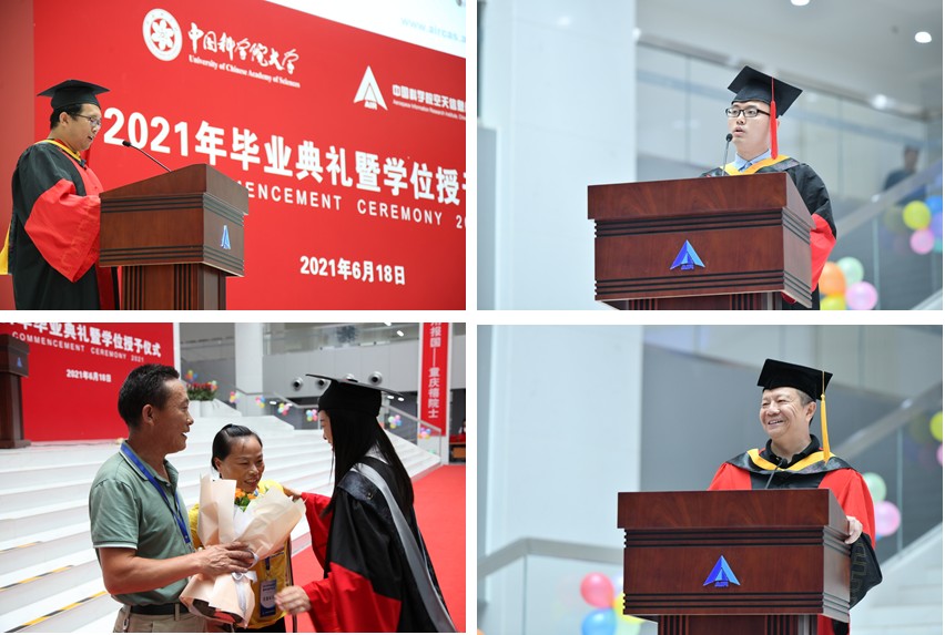 2021届毕业生樊程的父亲樊孝云代表家长发言。他提到同学们成长为具备雄厚专业知识和健全人格的高级人才,是来自父母、老师们的全心培养和辛勤的付出,并希望大家常怀感恩之心,为祖国航天事业的发展贡献更多力量。导师代表、研究员赵忠明作了精彩讲话,在现场与同学们一同回忆做实验、写本子、写论文的科研生活经历。他活泼有趣的话语引起阵阵欢笑和掌声,流露出的真挚情感使人久久不能忘怀。