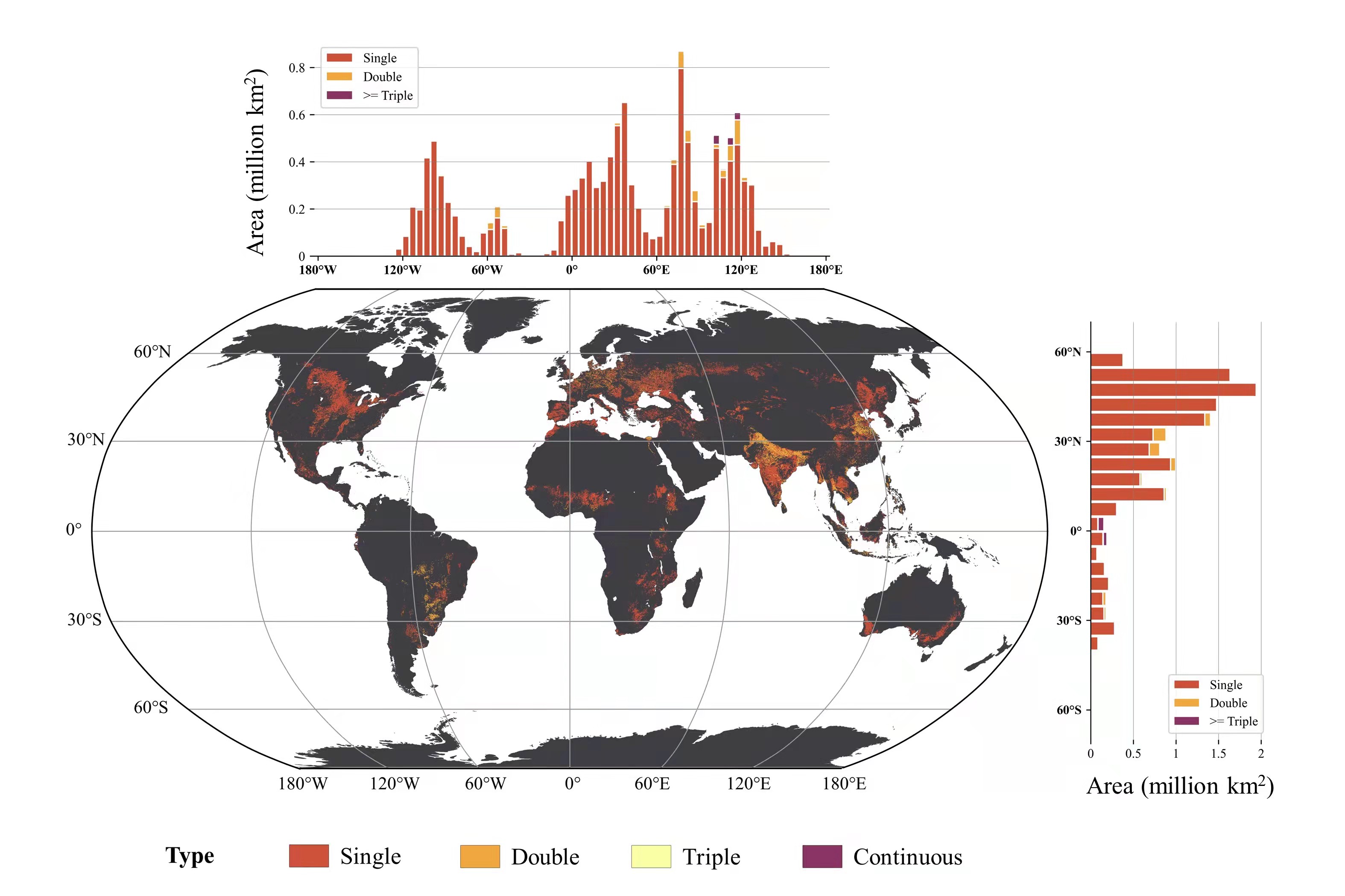 最新发布的数据产品显示,全球81.6%耕地为单季种植模式,复种主要集中在东亚、东南亚、南亚、南美洲和尼罗河三角洲,75%的三季作物种植模式分布在热带地区。中国平均复种指数在近20年小幅下降约6%,其中南方复种有所下降、北方复种指数总体增加,反映出耕地保护、鼓励休耕和轮作等农业政策在提升耕地可持续利用方面的积极作用。