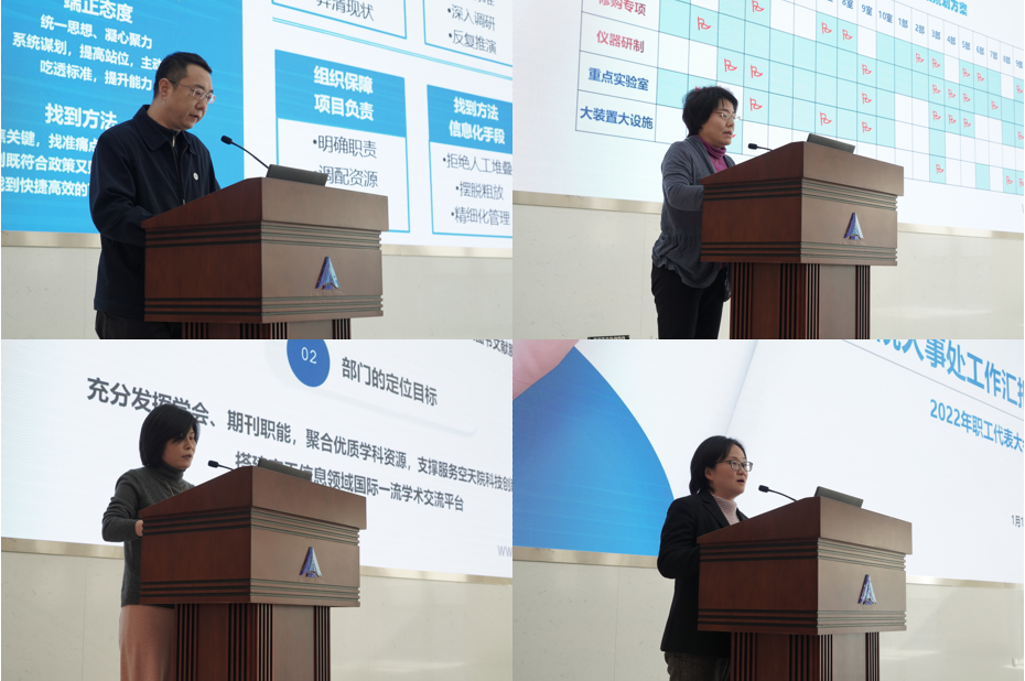 随后,工会主席禹卫东作题为《凝心聚力实干,全力服务科技创新》的工会、职代会工作报告。报告全面介绍了2021年工会、职代会各项工作开展情况,包括规章制度完善与组织机制调整、工会干部年度培训、一线职工慰问与帮扶困难送温暖、丰富多彩文体活动、活动场地维修改造、职工福利保障、职工提案征集与落实、分工会工作考核等。2022年,工会将进一步加强政治引领,坚持党的领导,服务空天院发展大局;进一步加强自身建设,持续完善工会各项制度和加强工会干部学习,提升工会组织服务职工、保障职工权益的能力;继续做好职工福利、职工关怀等各类事项,传递温暖;进一步加强提案征集工作,拓宽征集渠道、加大办理落实力度;进一步发挥分工会和协会作用,扩大职工广泛参与度等。